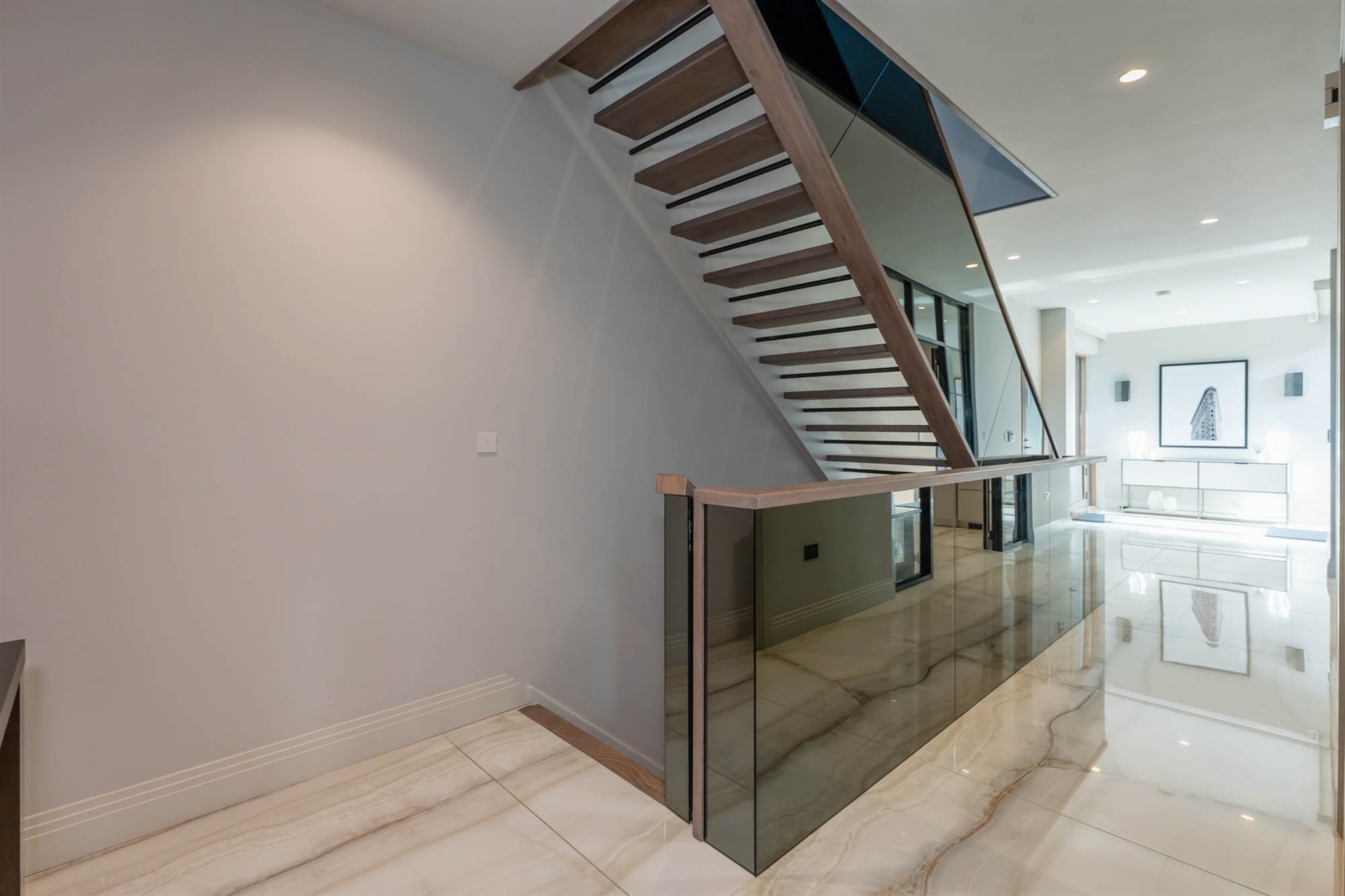 From ground floor there is a bespoke designed balustrade with smoked glazed trim and open tread stairwell leading to: