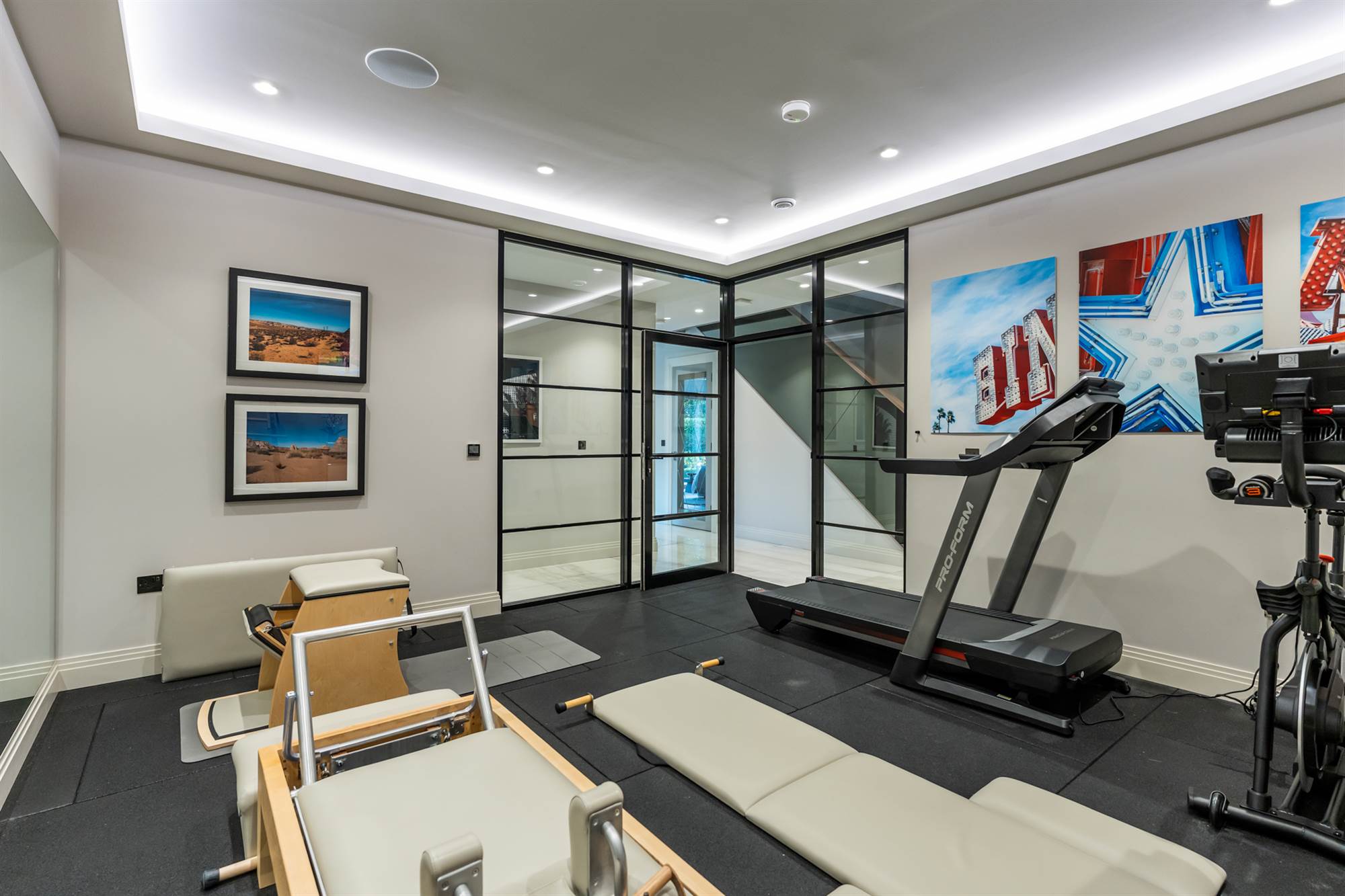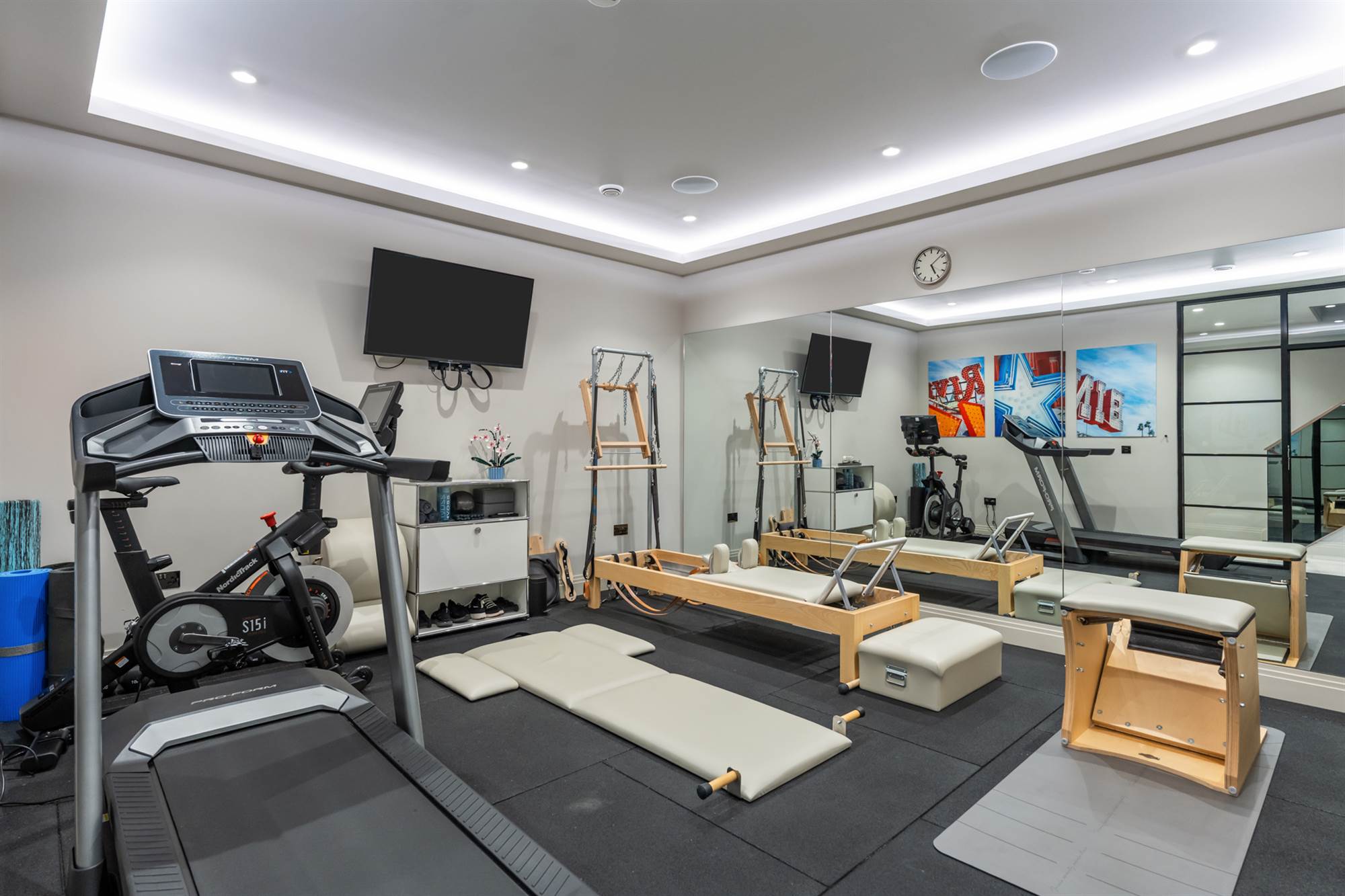 Full gymnasium room and pilates studio with crittall walls, fitted mirrors, bespoke lighting & sound and specialist flooring