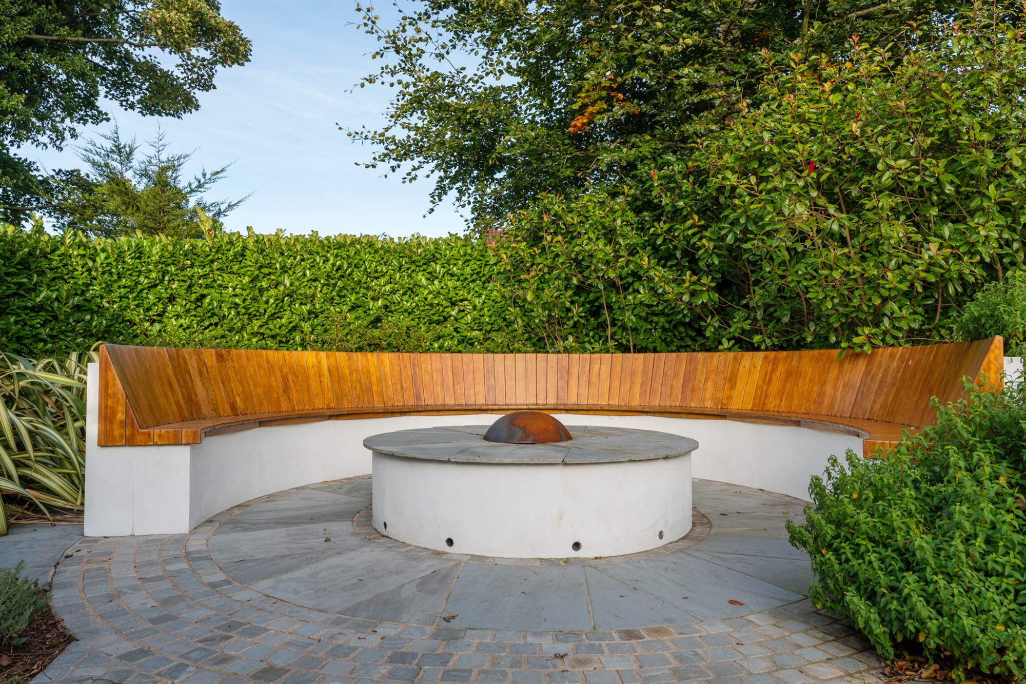 Bespoke firepit to the bottom of the gardens with central gas fire and built in seating overlooking SW facing gardens