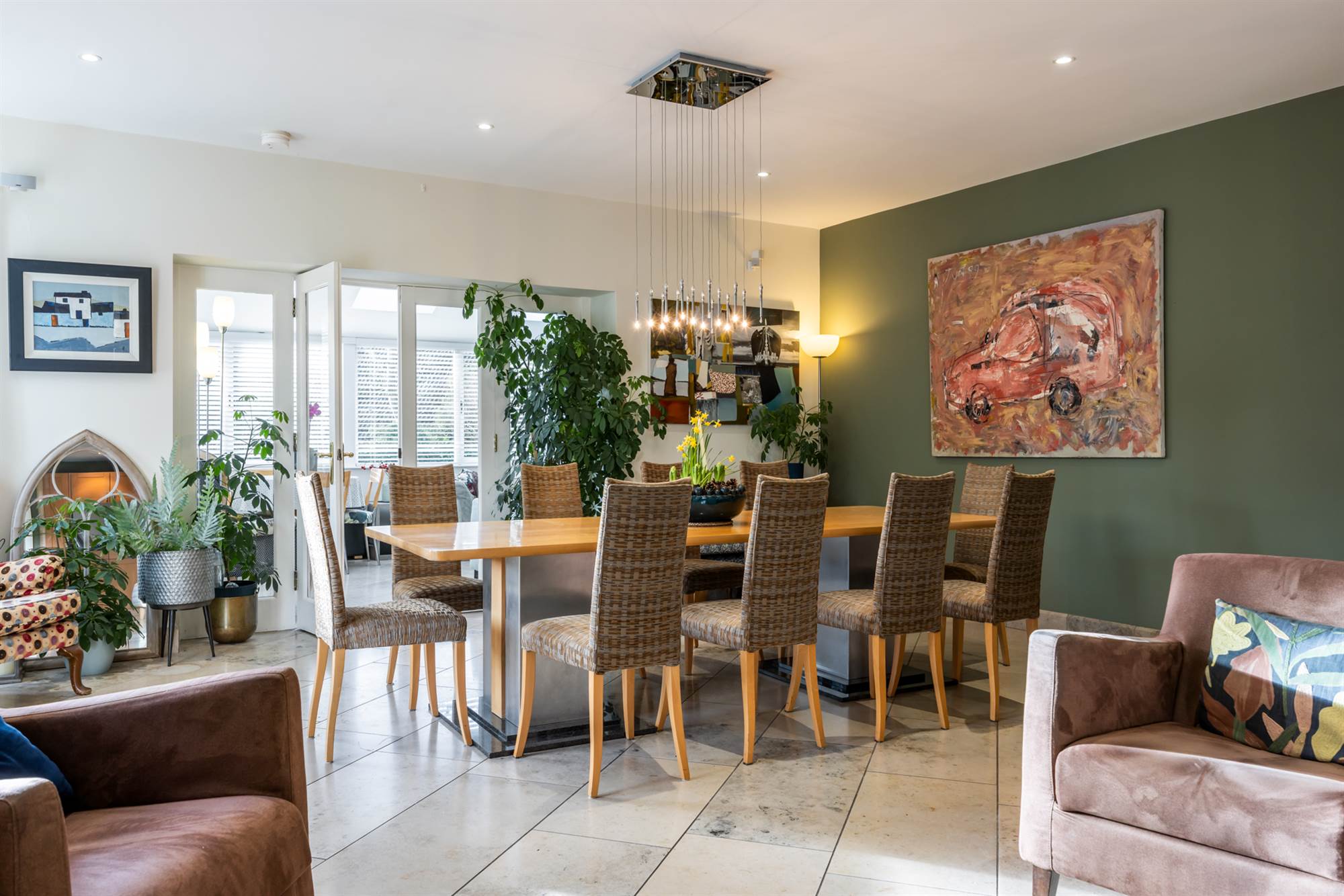Generous dining area with space for 10 - 12 seater table and chairs with glazed doors to: