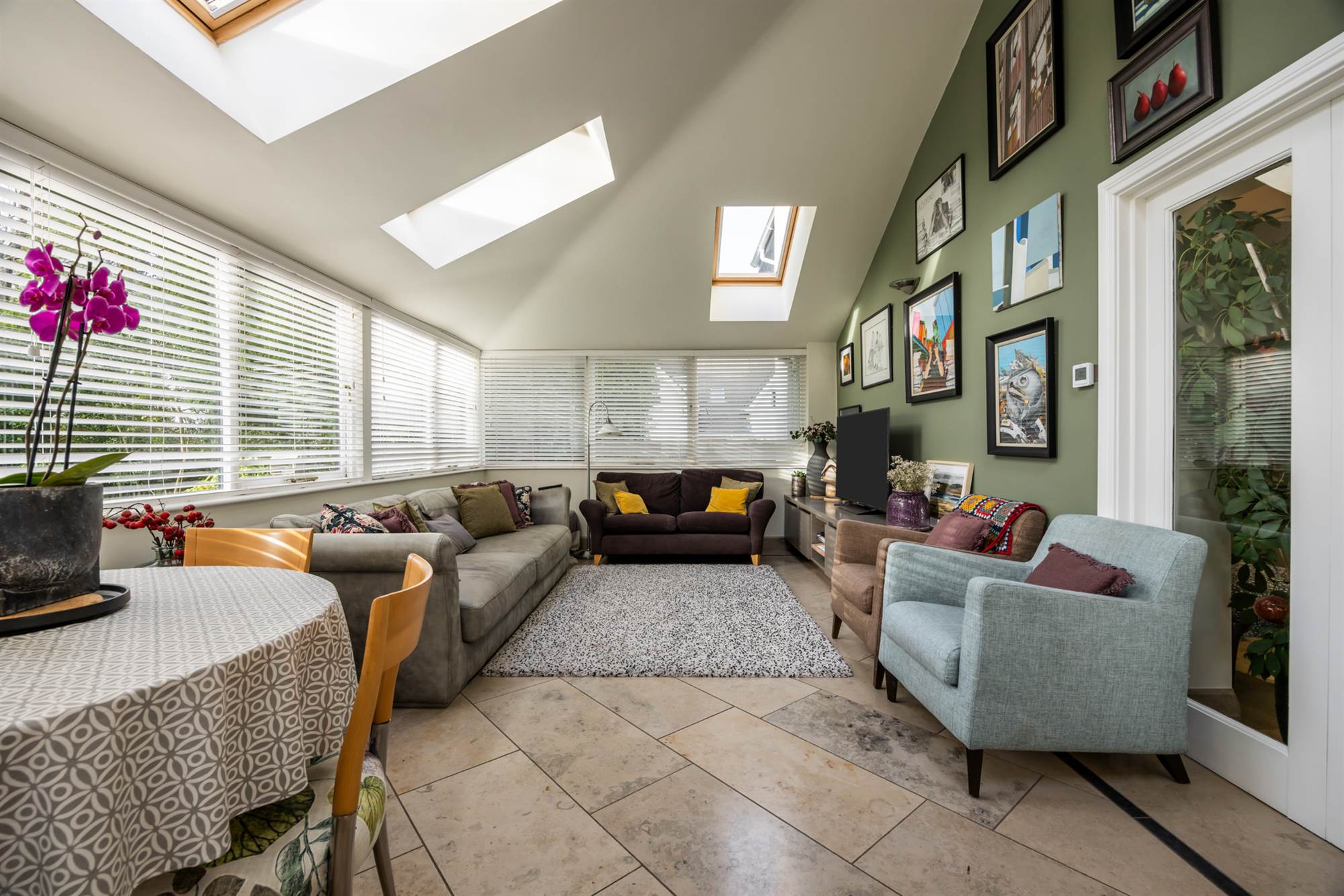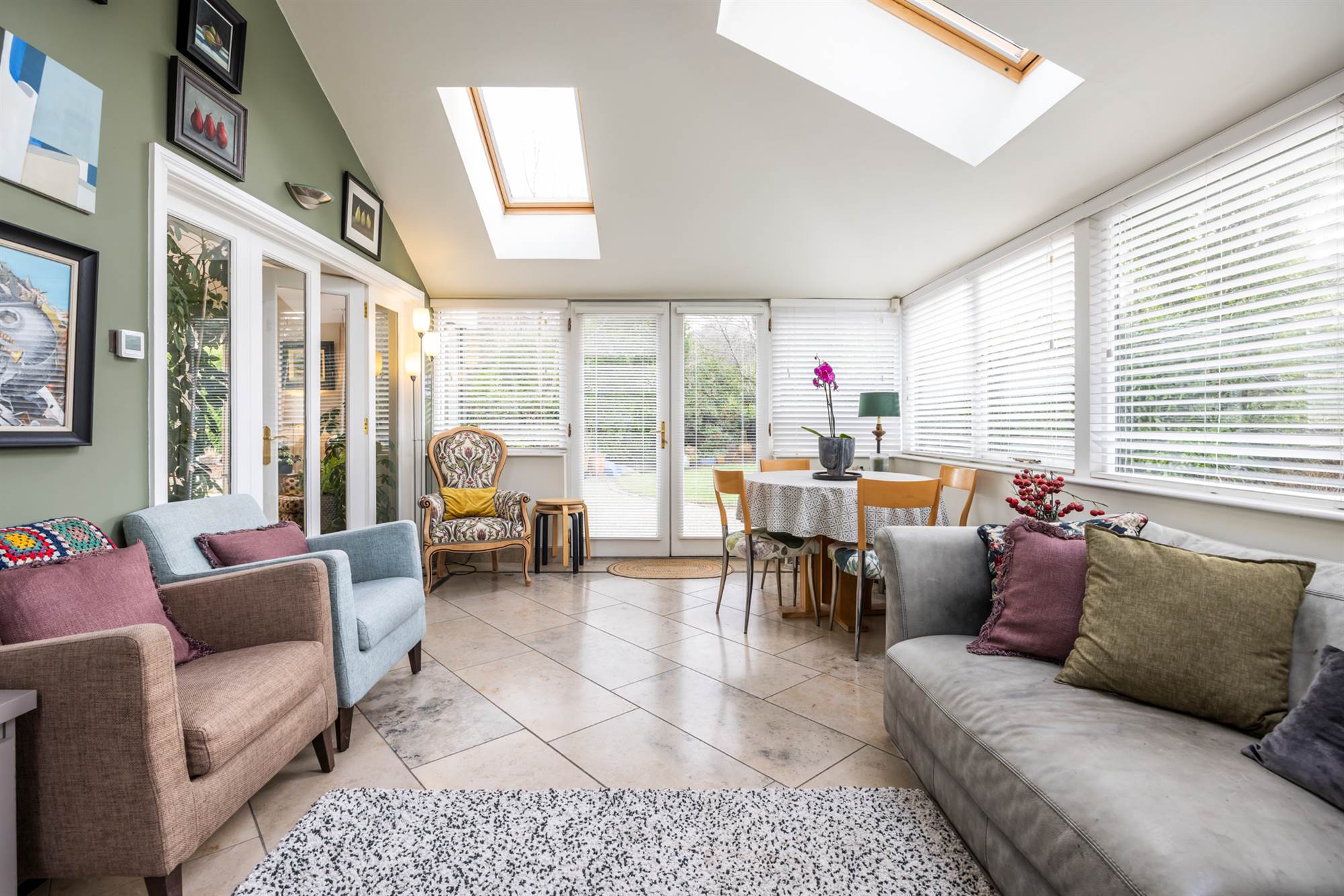 Natural limestone floor, windows all the way round, glazed French doors leading to gardens and patios. Pitched ceiling with 4 Velux windows giving lots of natural light, media wall, underfloor heating brings in warmth so the room can be enjoyed all year round.