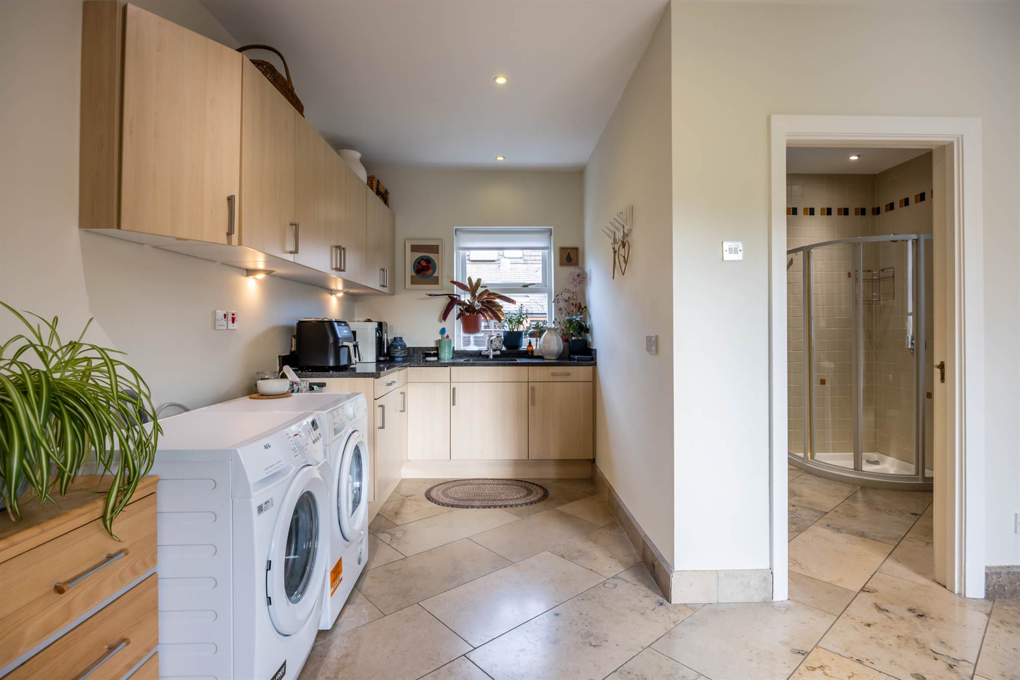Utility room with laundry facilities, ground floor shower room and integral double garage with electric up and over door