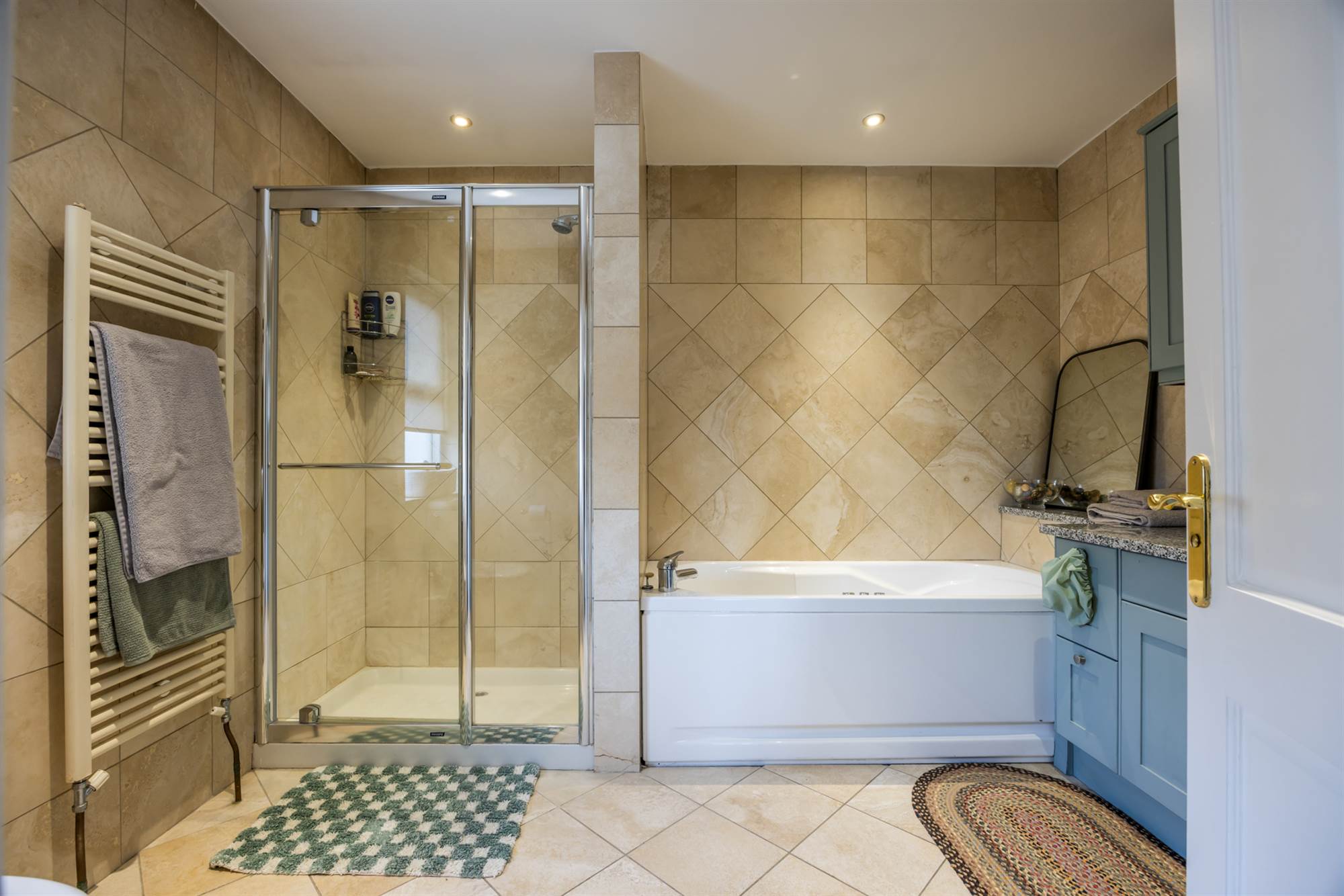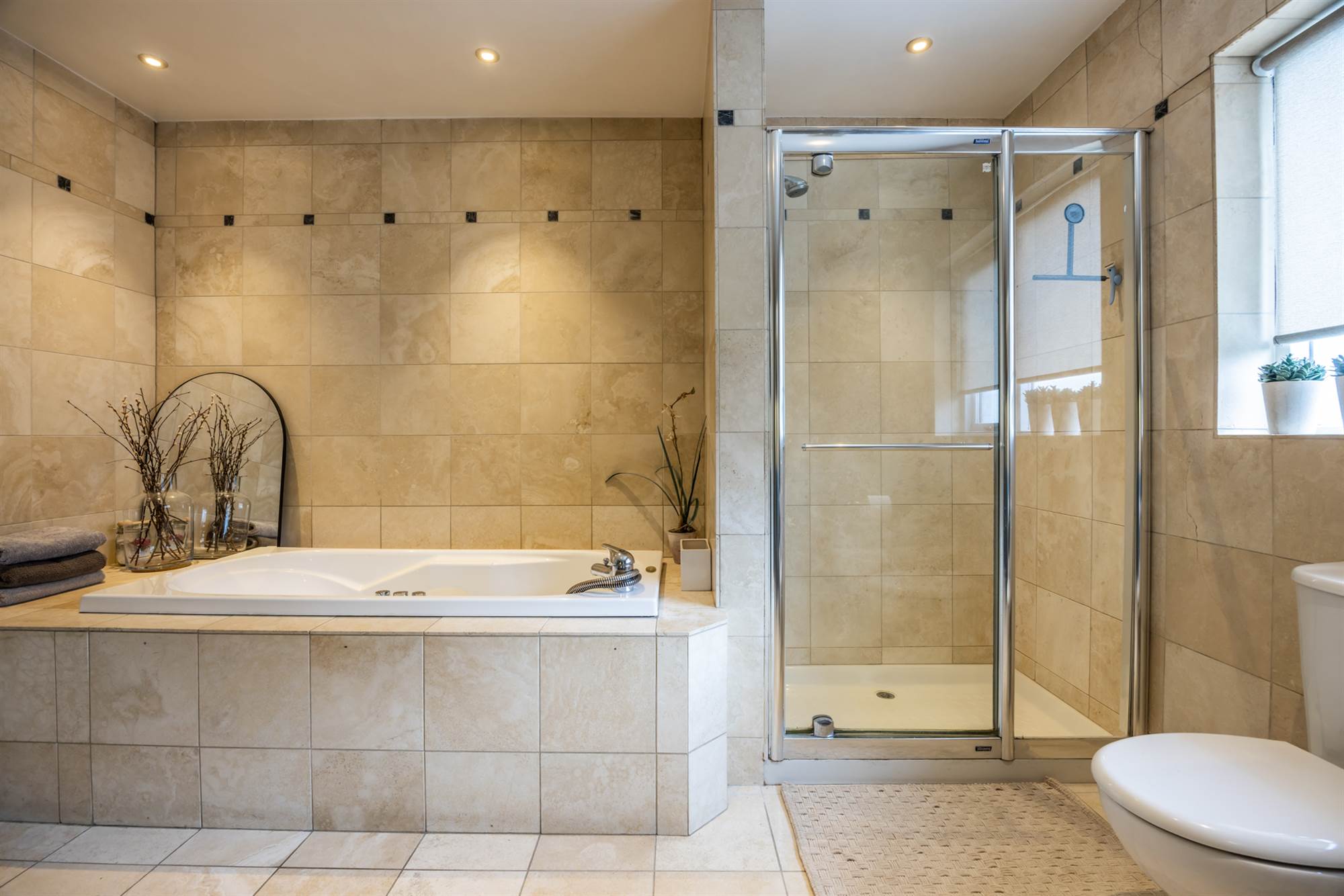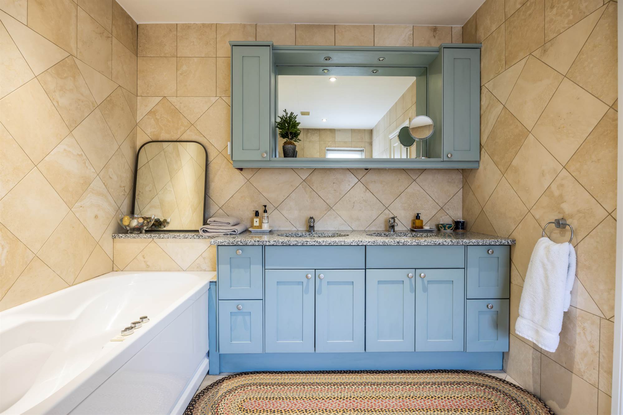 Deep fill, jacuzzi style, multi-jet bath with mixer taps, dual sinks in granite with storage beneath and mirrored vanity unit above. Walk in double shower with thermostatic shower, heated towel rail, low flush wc, tiled walls and floor, low voltage lighting and extractor fan.