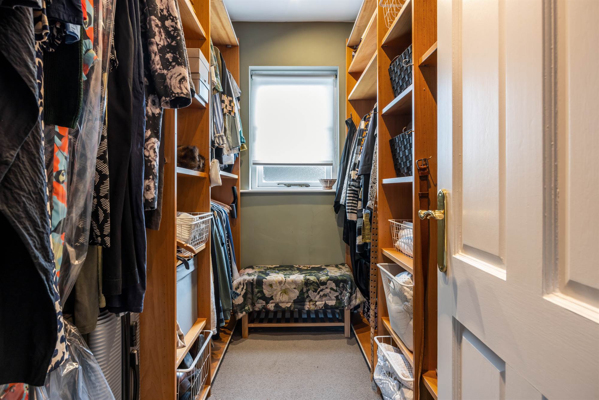 On each side there is buillt in hanging, shelving and open storage space.