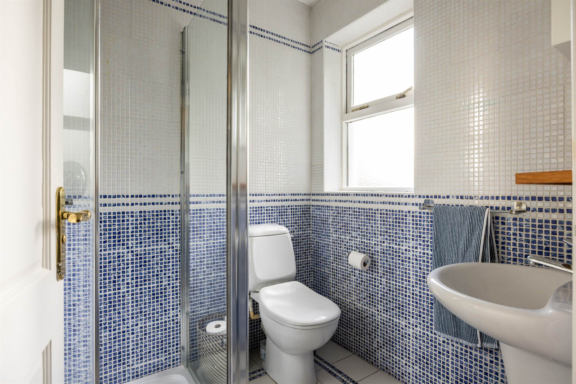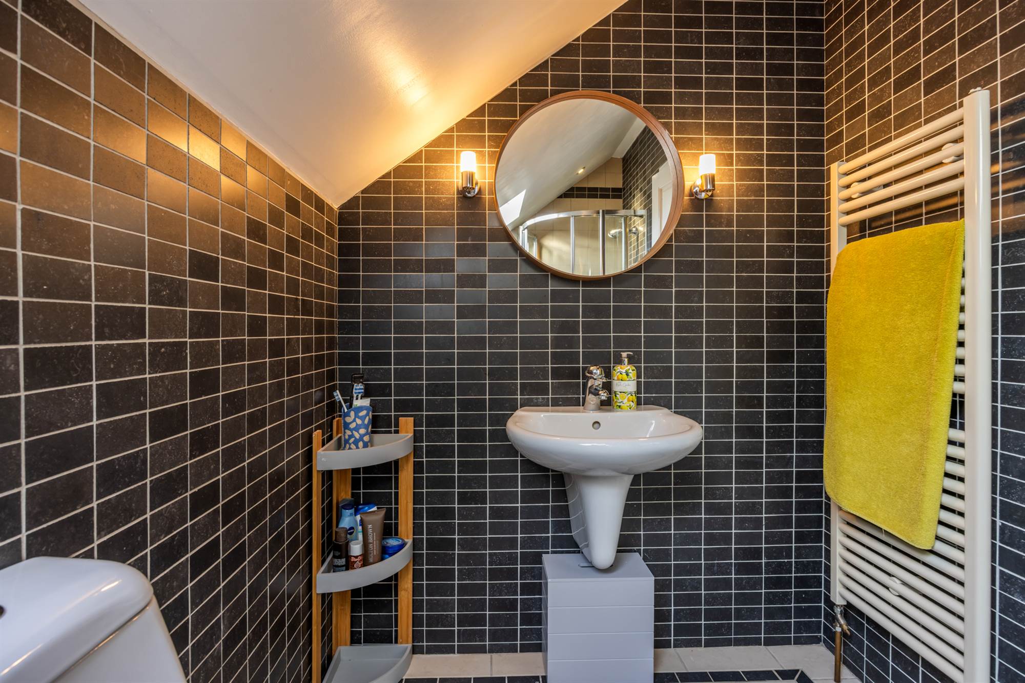 Fully tiled walls and floor, corner shower cubicle, pedestal wash hand basin, low flush wc, heated towel rail, extractor fan, Velux window.