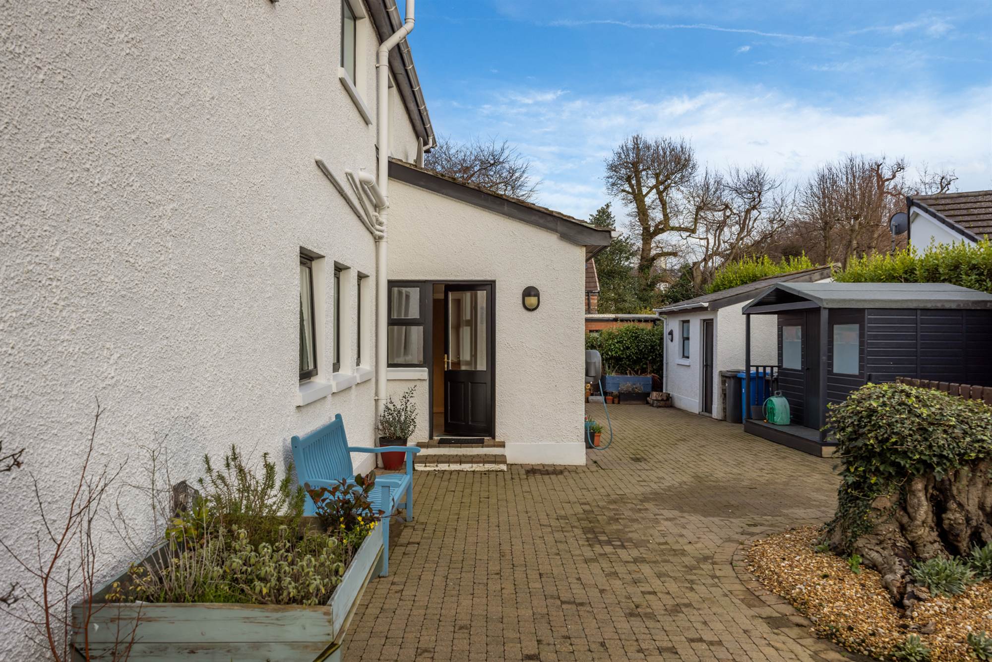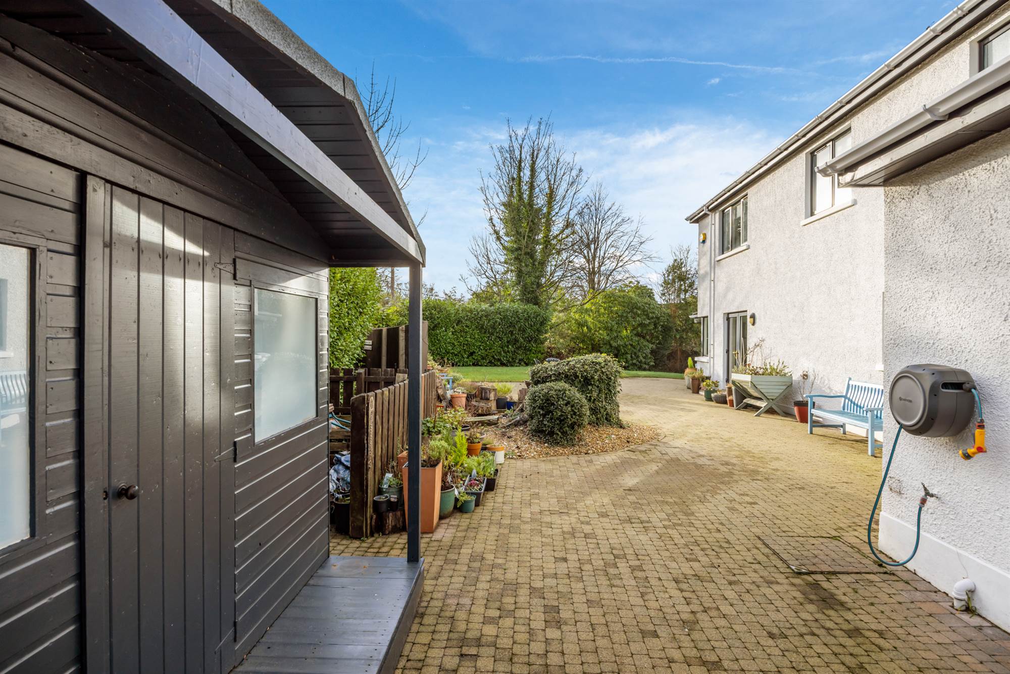 The brick pavior garden with BBQ area. There is a patio aroundr south-west facing lawn bordered by mature hedging, rhododendron and specimen trees which goes all around the front and side of the property. There is a fire pit area and a circular rear patio, also box hedging to the front which leads to the access patios and front door.