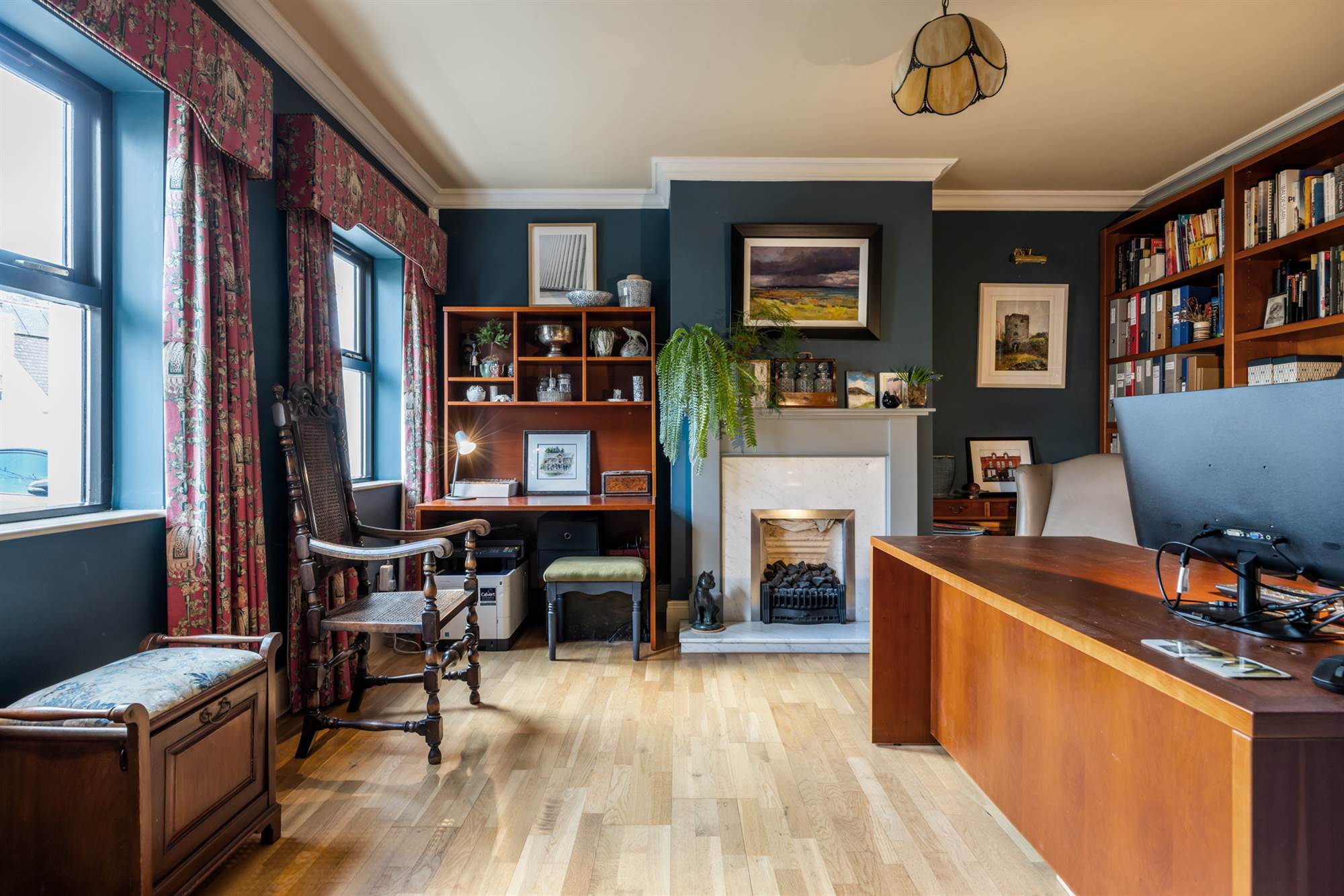 Currently laid out in a home office style with central fireplace and solid wooden mantlepiece, marble hearth, gas fire, wooden floor, two windows to front and coved ceiling.