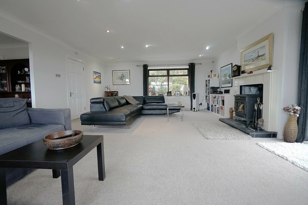 Stanley multi-fuel stove with polished marble surround, slate hearth. Feature apex oriel window, uPVC double glazed double doors to raised timber decked area. Carpeted.