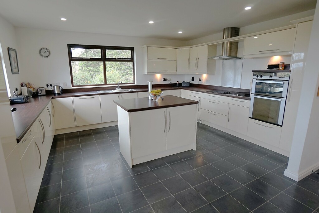 Modern gloss cream kitchen with excellent range of high and low level units, wood block effect laminate worktops, stainless steel sink unit with drainer and mixer tap, Whirlpool 4 ring ceramic hob, stainless steel splashback and extractor fan, built-in double oven, built-in dishwasher, integrated fridge freezer, matching island with electric point. Window seat. Tiled floor.