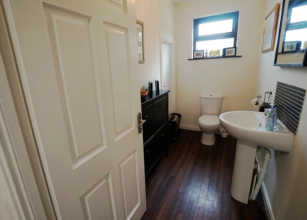 Low flush WC and pedestal wash hand basin with mixer tap, tiled splashback. Additional storage cupboard under stairs. Wood flooring.
