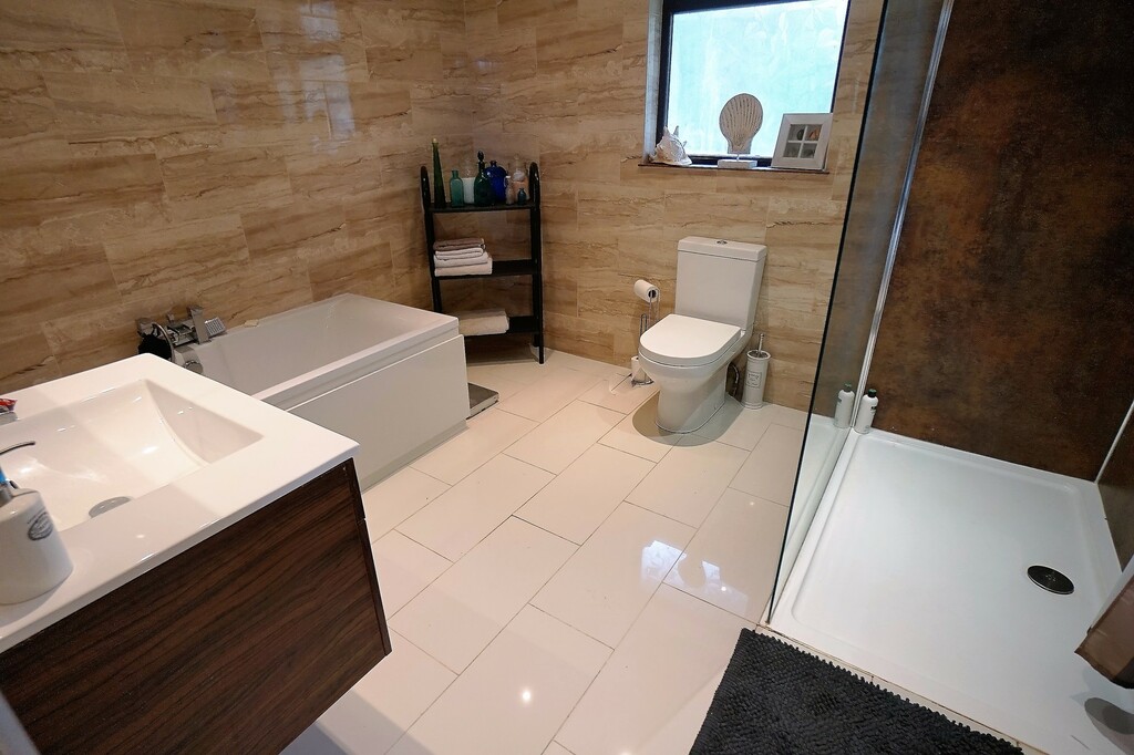 Contemporary white bathroom suite comprising of panelled bath with centre mixer tap and telephone hand shower,. Fully tiled built-in shower cubicle. Vanity wash hand basin basin with mixer tap, low level drawers. Low flush WC.Fully tiled wall. Ceramic tiled floor.