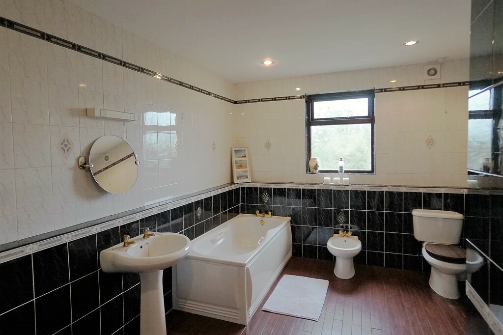 Bathroom suite comprising of panelled bath, fully tiled built-in shower cubicle, pedestal wash hand basin, low flush WC, bidet. Fully tiled walls. Amtico flooring.