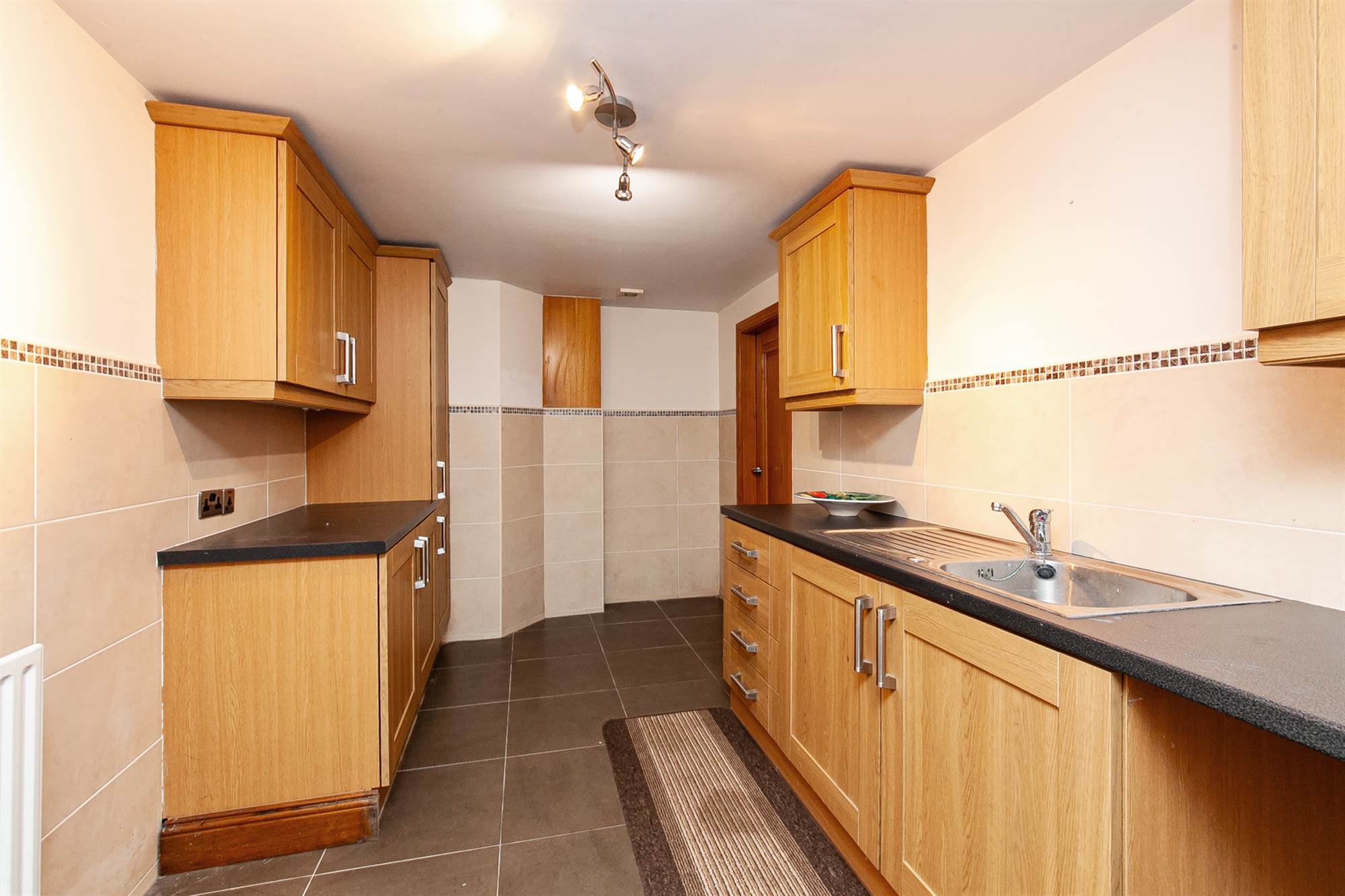 Excellent range of high and low level oak effect units, laminate work surface, single drainer stainless steel sink unit, chrome mixer taps, plumbed for washing machine, space for dryer, ceramic tiled floor, part tiled walls, walk-in linen press fitted with shelving and Worcester Bosch gas fired boiler.