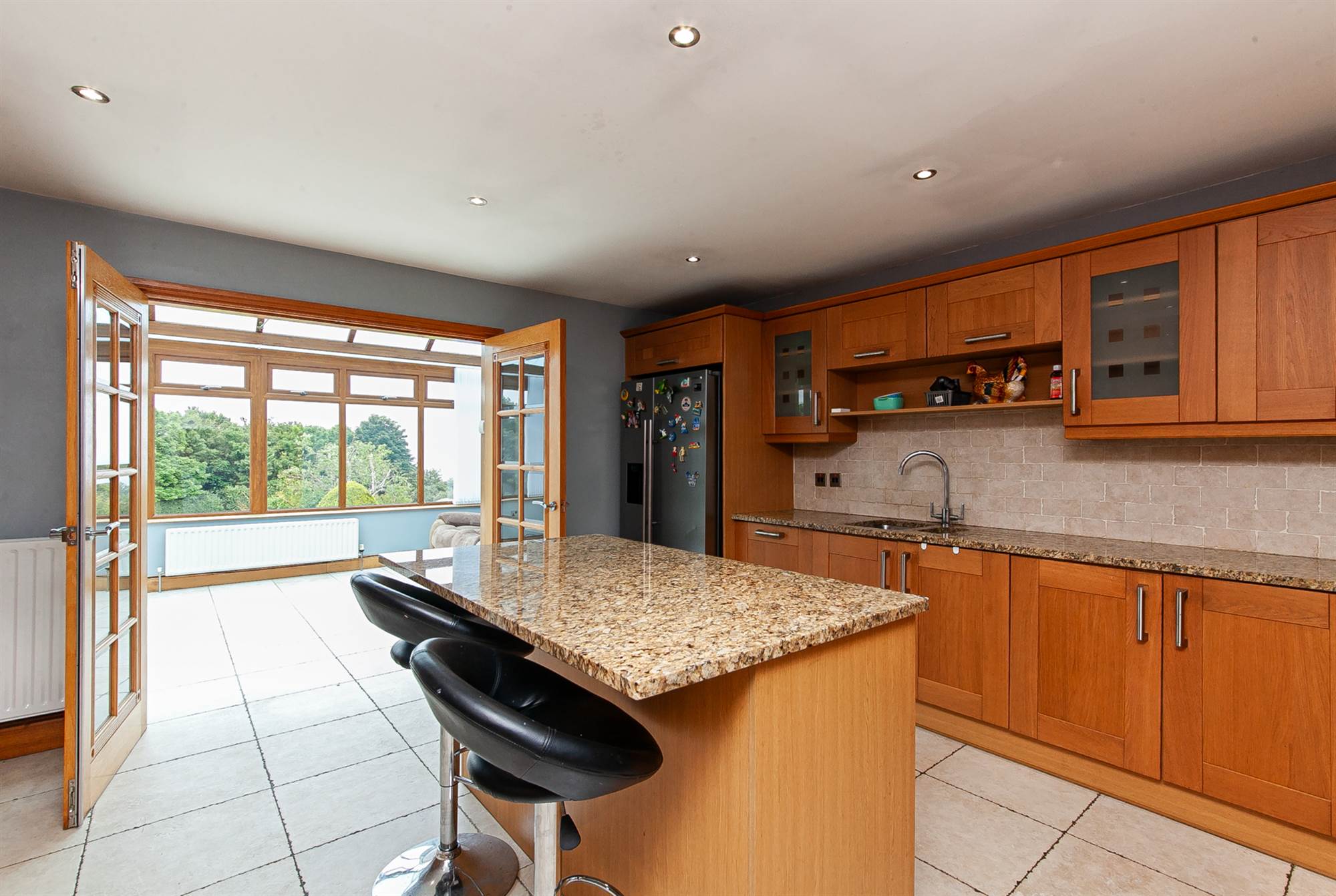 Excellent range of oak high and low level units, stainless steel fittings, granite work surface, single drainer inset sink and a half sink unit, chrome mixer taps, integrated dishwasher, Samsung ice making American style fridge freezer, built-in glazed display cabinets, ceramic tiled floor, part tiled walls, Smeg range stainless steel cooker with six ring gas hob and hot plate, glass splashback, electric ovens below, stainless steel extractor hood, integrated stainless steel combination microwave, built-in larder cupboards, island unit with matching granite work surface and built-in casual dining/breakfast bar, recessed spotlighting, concealed downlighting, built-in display shelving, glazed and bevelled double doors to front conservatory.