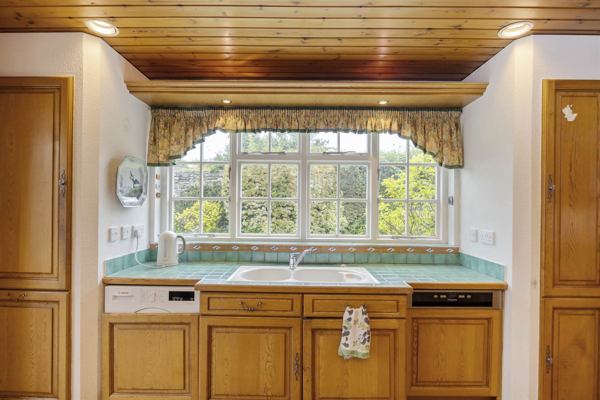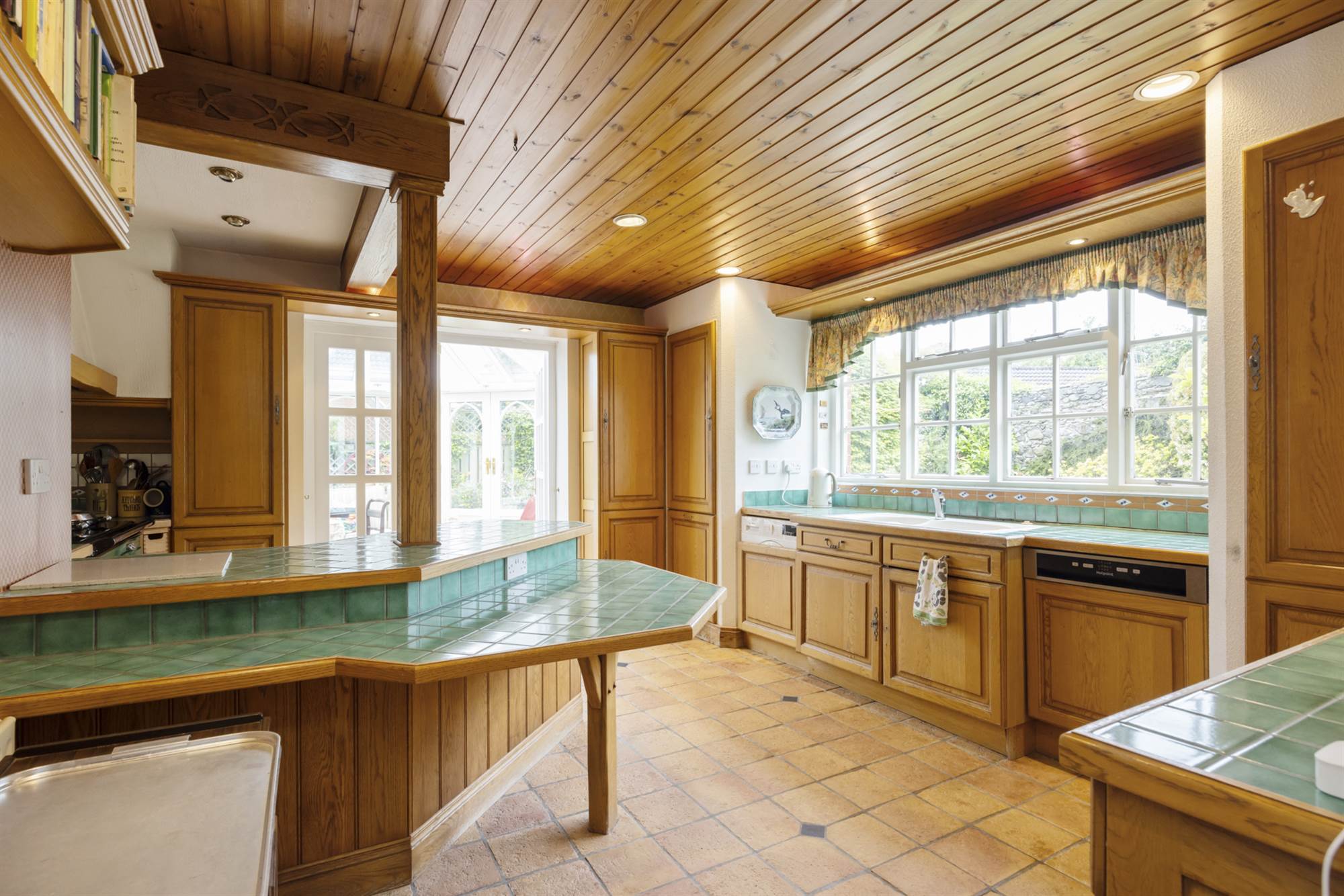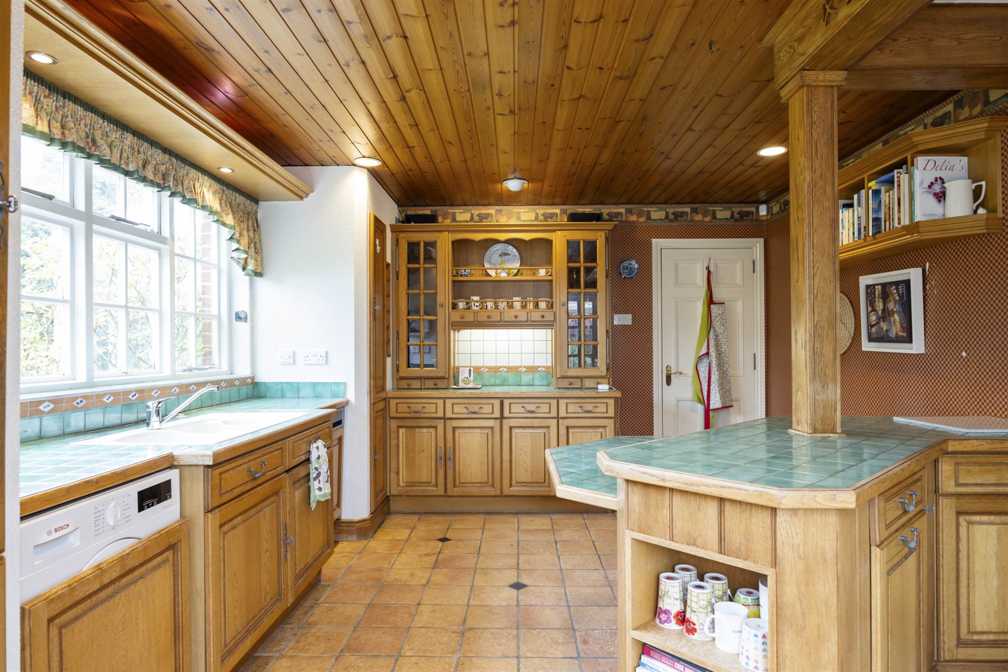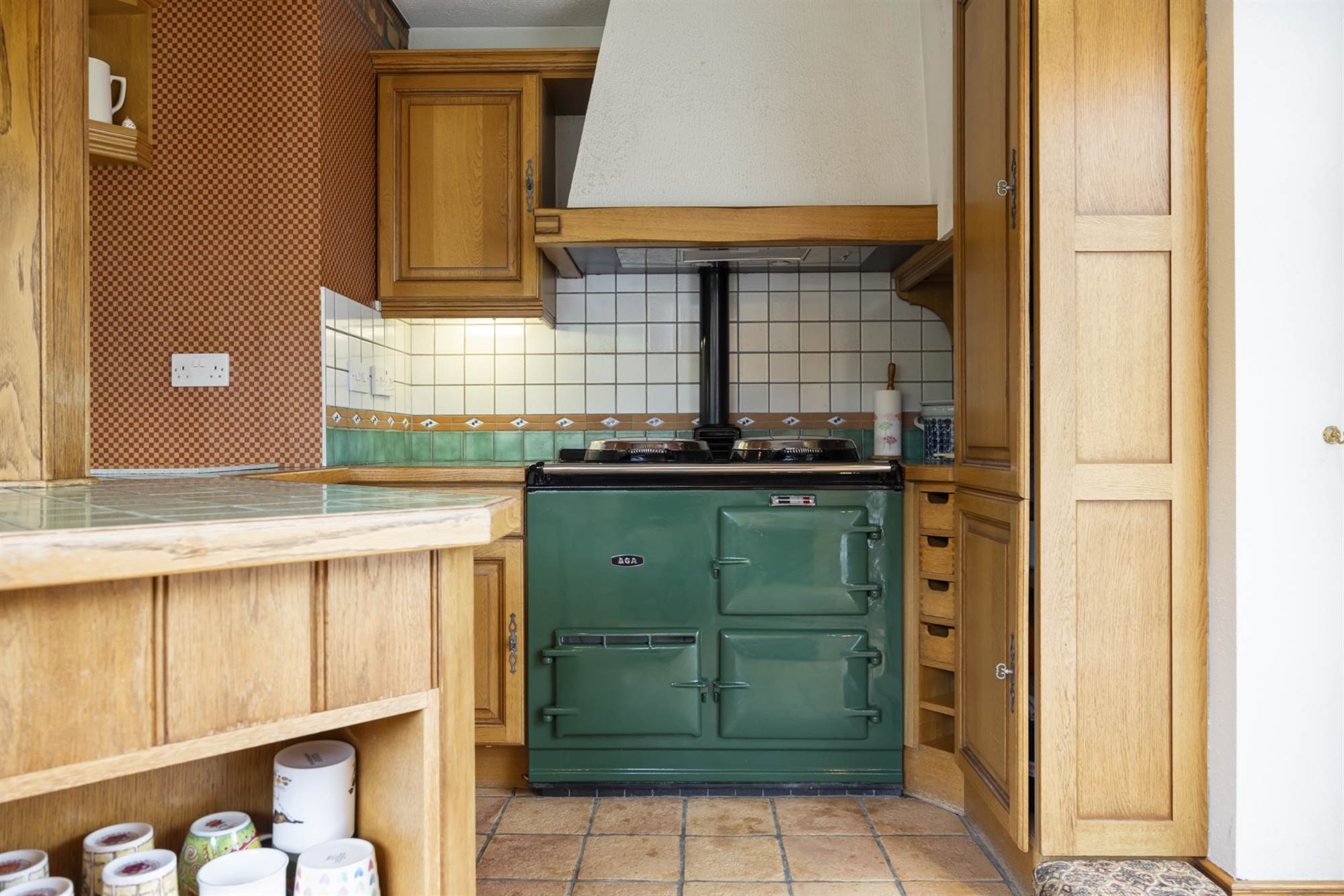 Range of high and low level fitted solid oak cabinets with tiled worktops, twin sink unit with mixer taps, integrated dish washer, integrated washing machine, integrated fridge, integrated freezer drawer, oil fired Aga. Tongue and groove panelled ceiling, tiled floors, part tiled walls, double opening doors to conservatory.