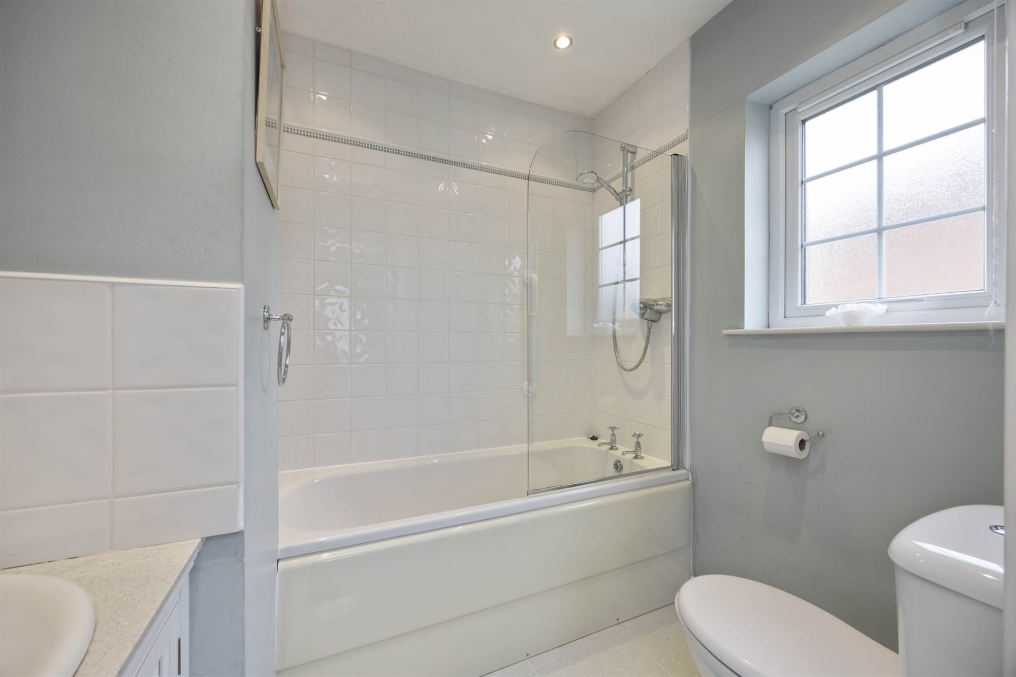 Low flush WC, wash hand basin, panelled bath with shower fitment, chrome heated towel rail, tiled floor, recessed lighting.