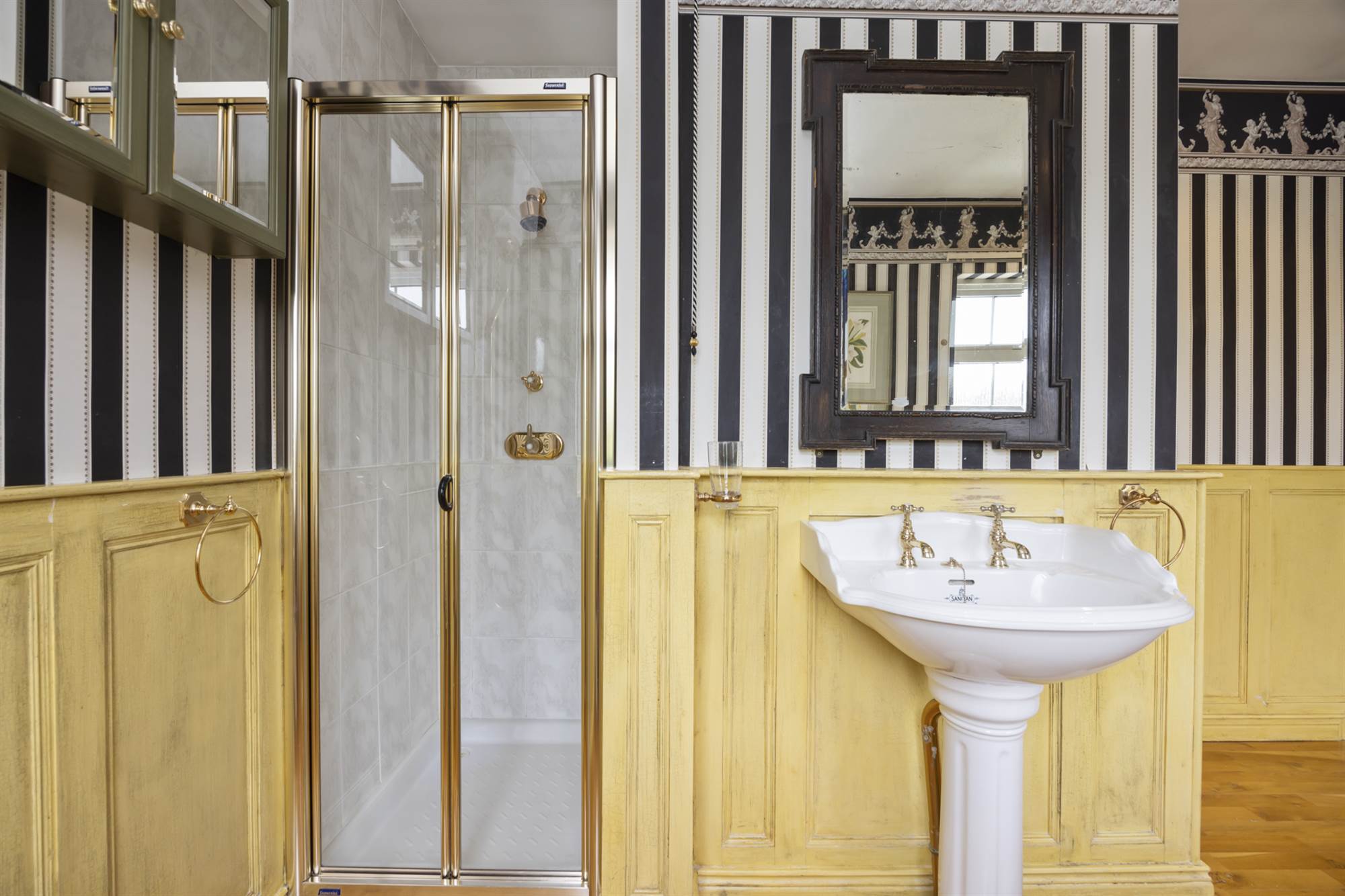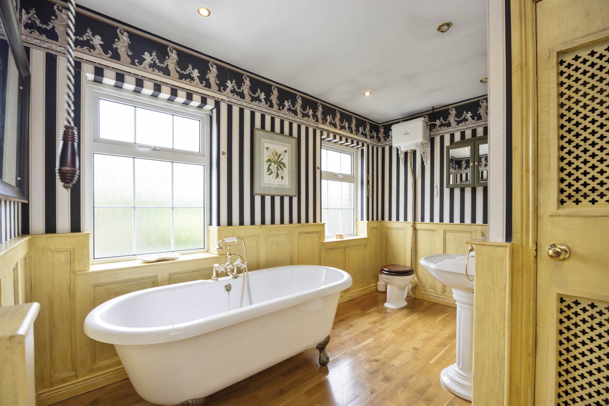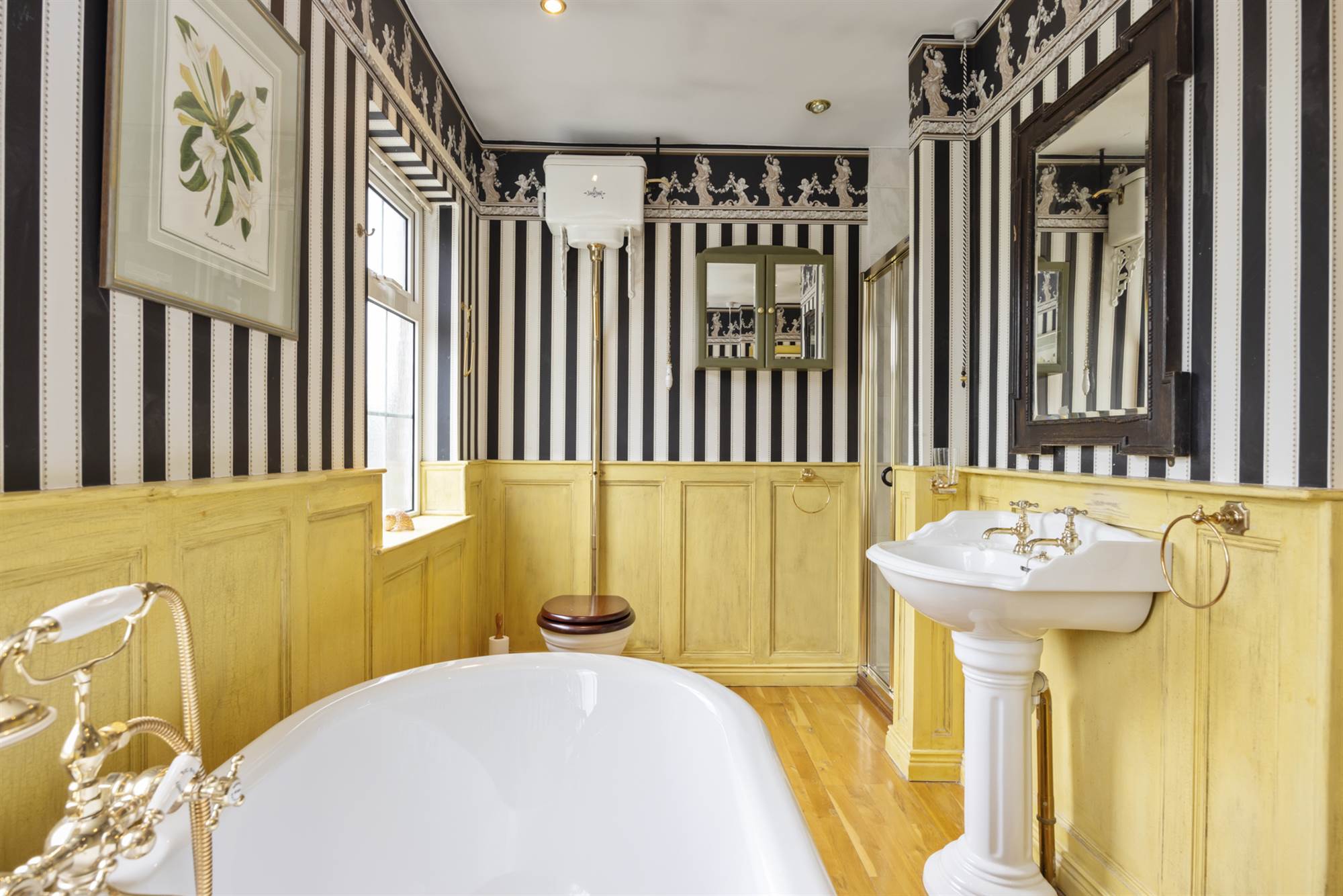 Traditional style WC, pedestal wash hand basin, freestanding bath with mixer taps and shower attachment, half panelled walls, recessed lighting, storage cupboard with hot water tank and shelving.