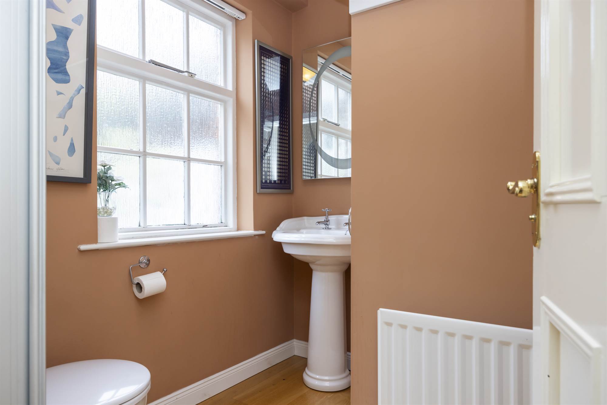 Low flush WC, pedestal wash hand basin, wood stripped floors, cloak hanging space.
