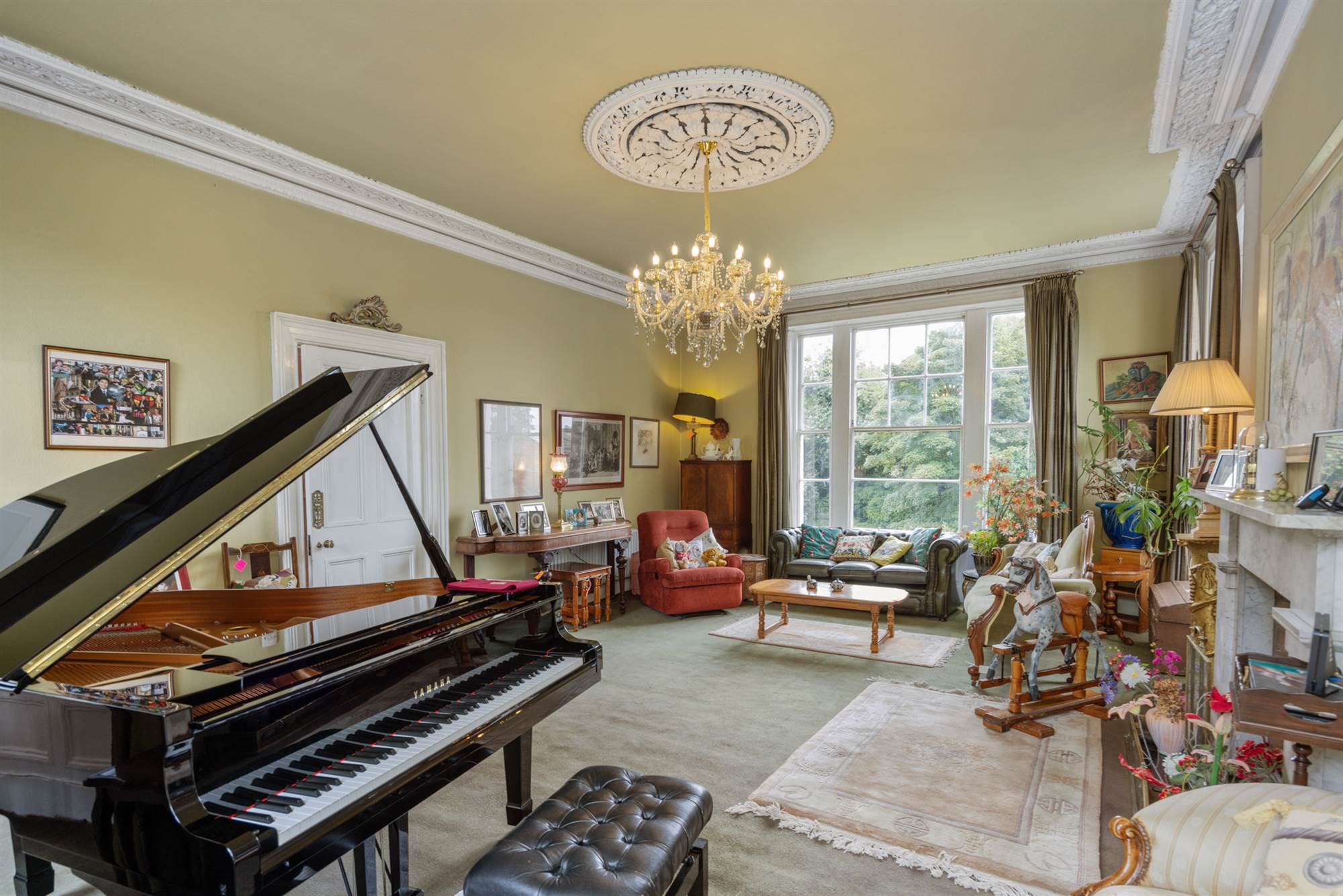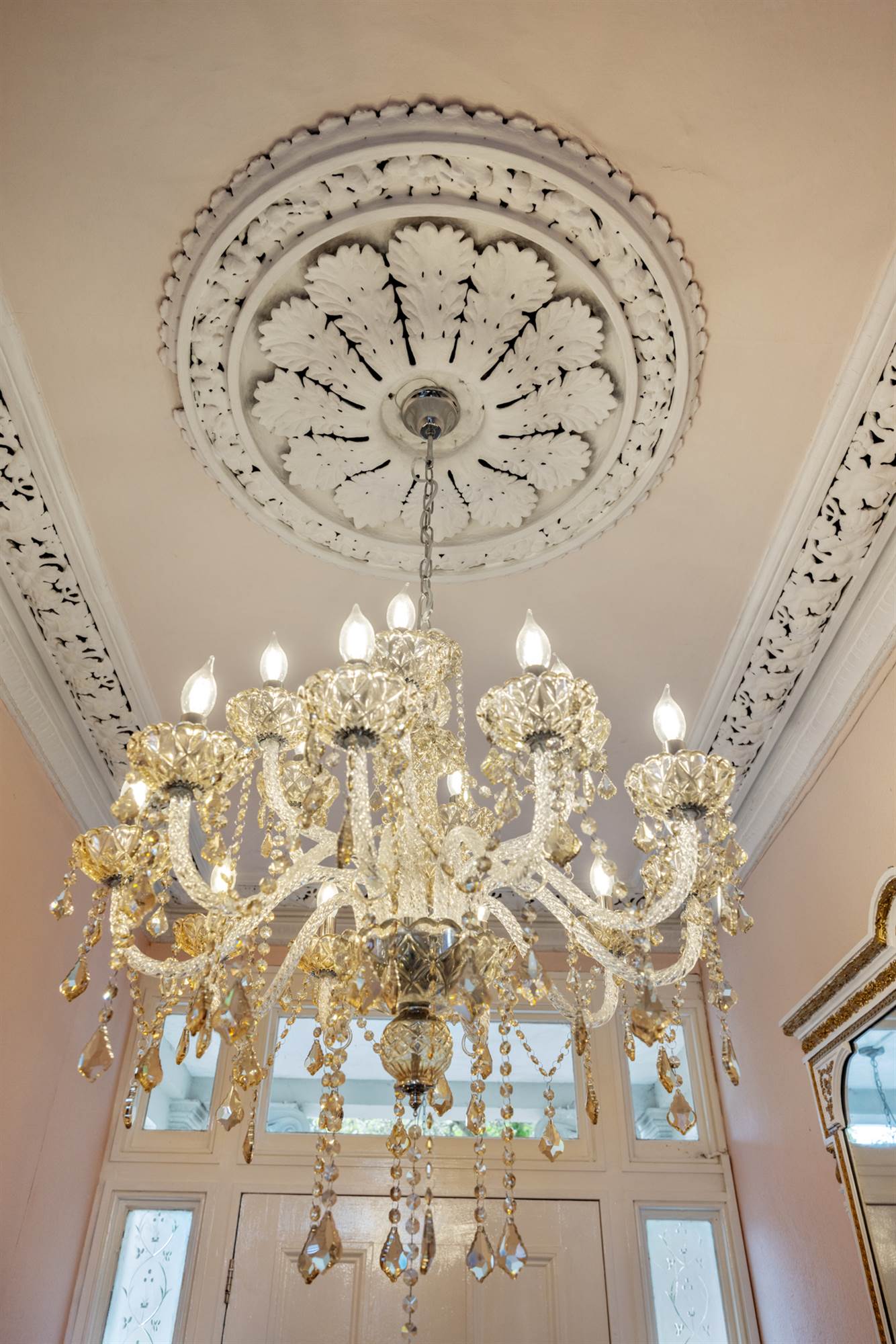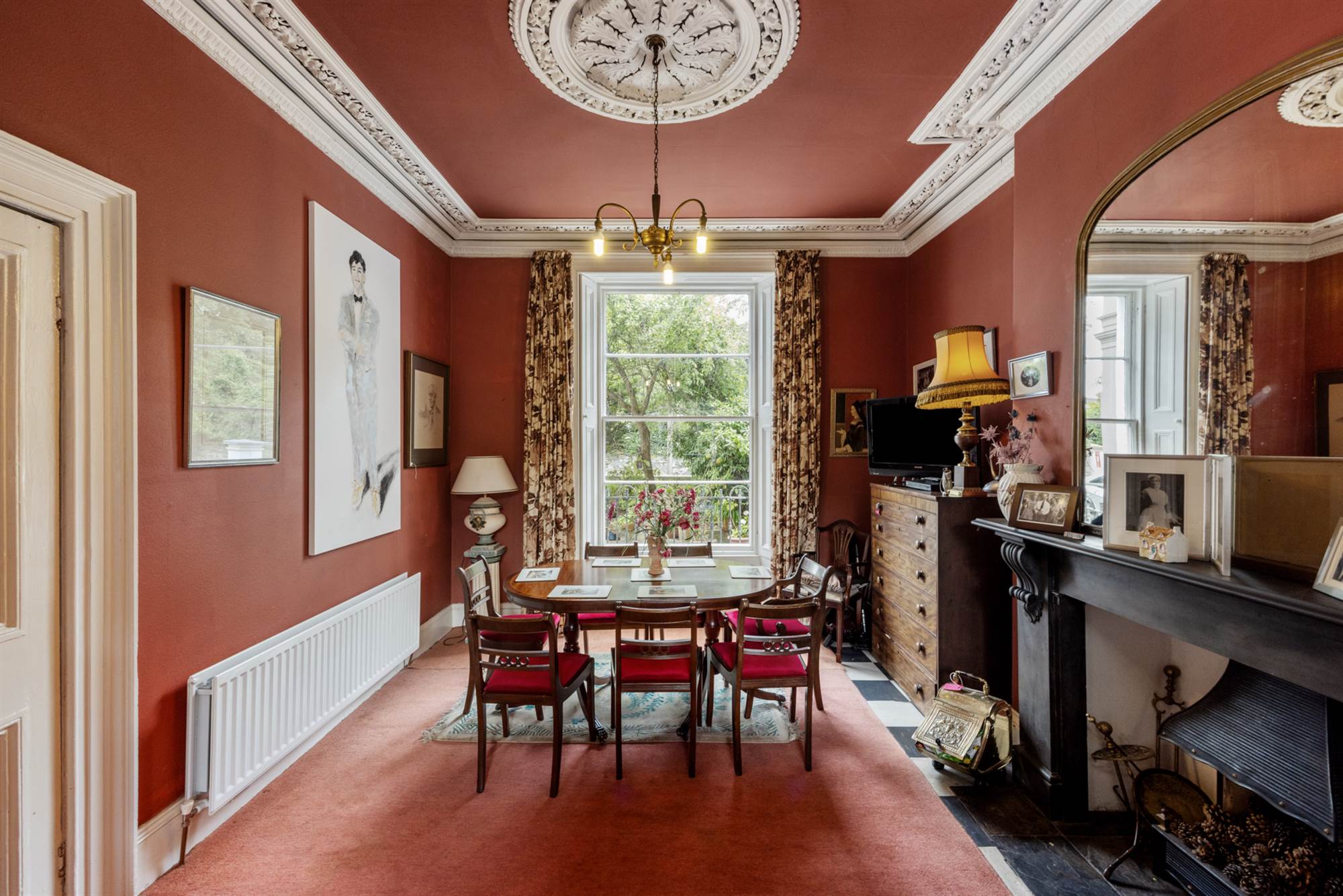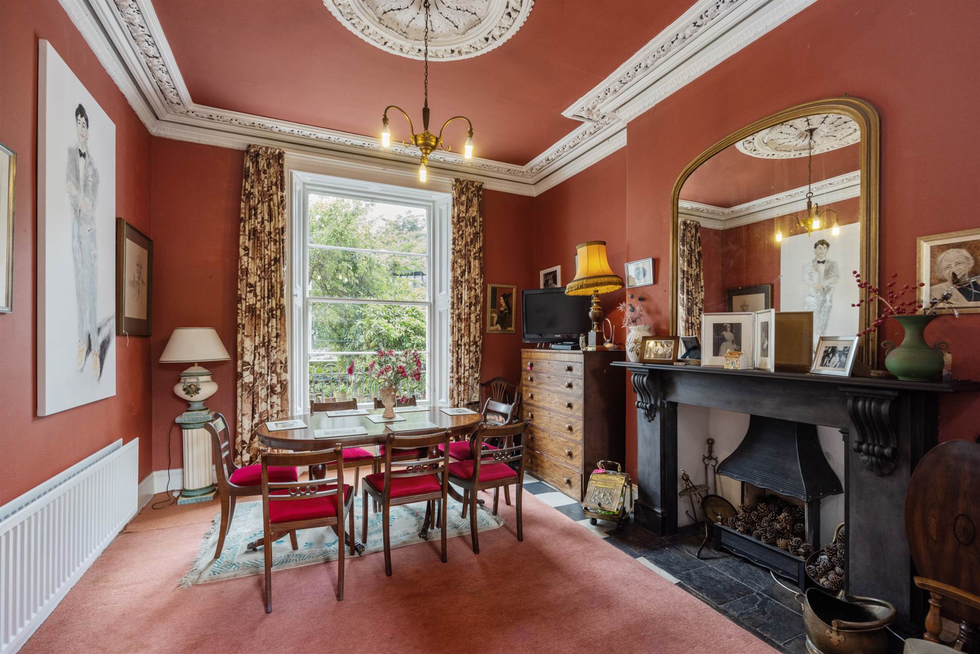 Ornate corniced ceiling, ceiling rose and corbels.