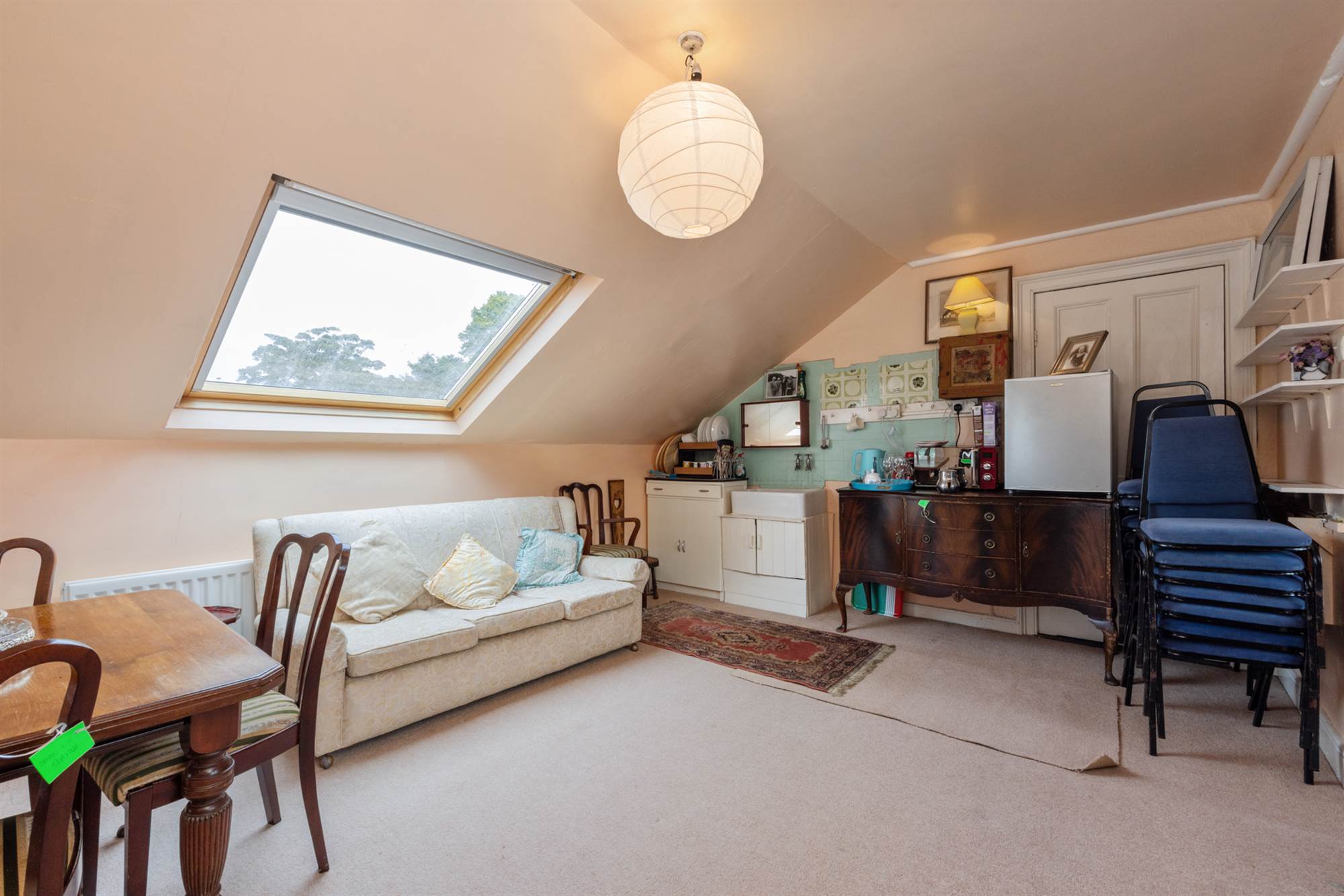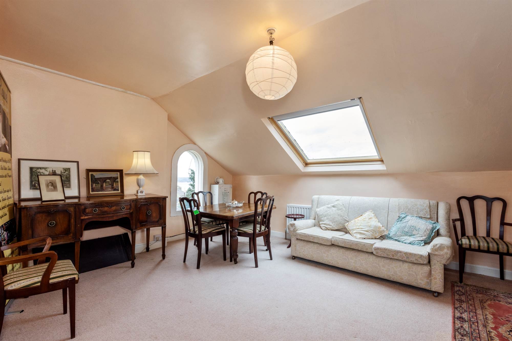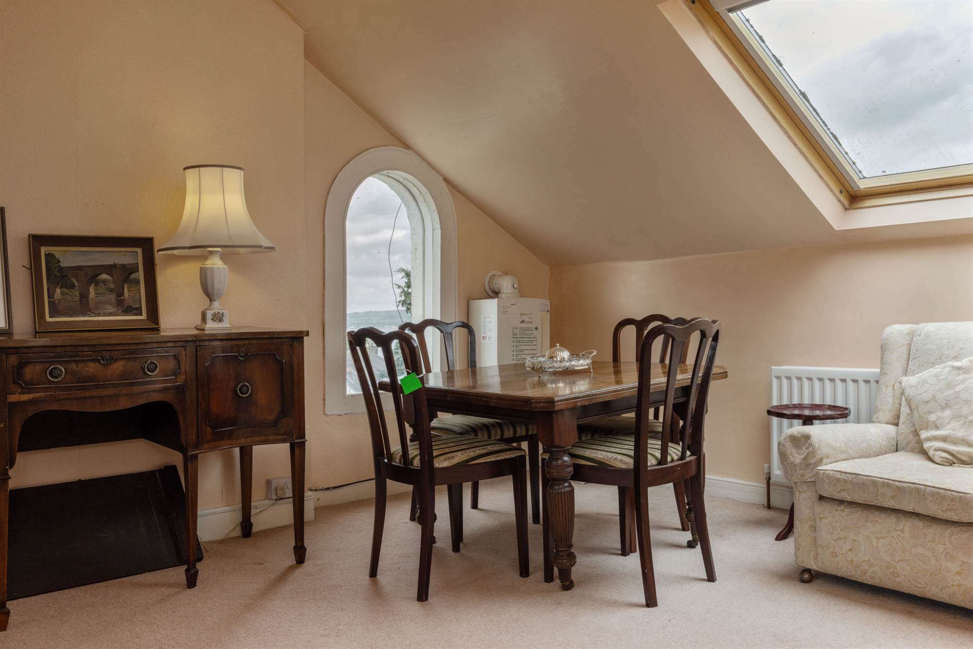 Velux window, feature arched window with views to Belfast Lough. Belfast sink. Gas boiler.