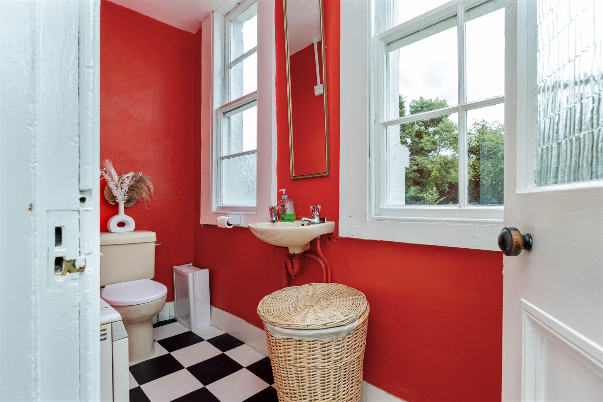 Pedestal wash hand basin, panelled bath, heated towel radiator.