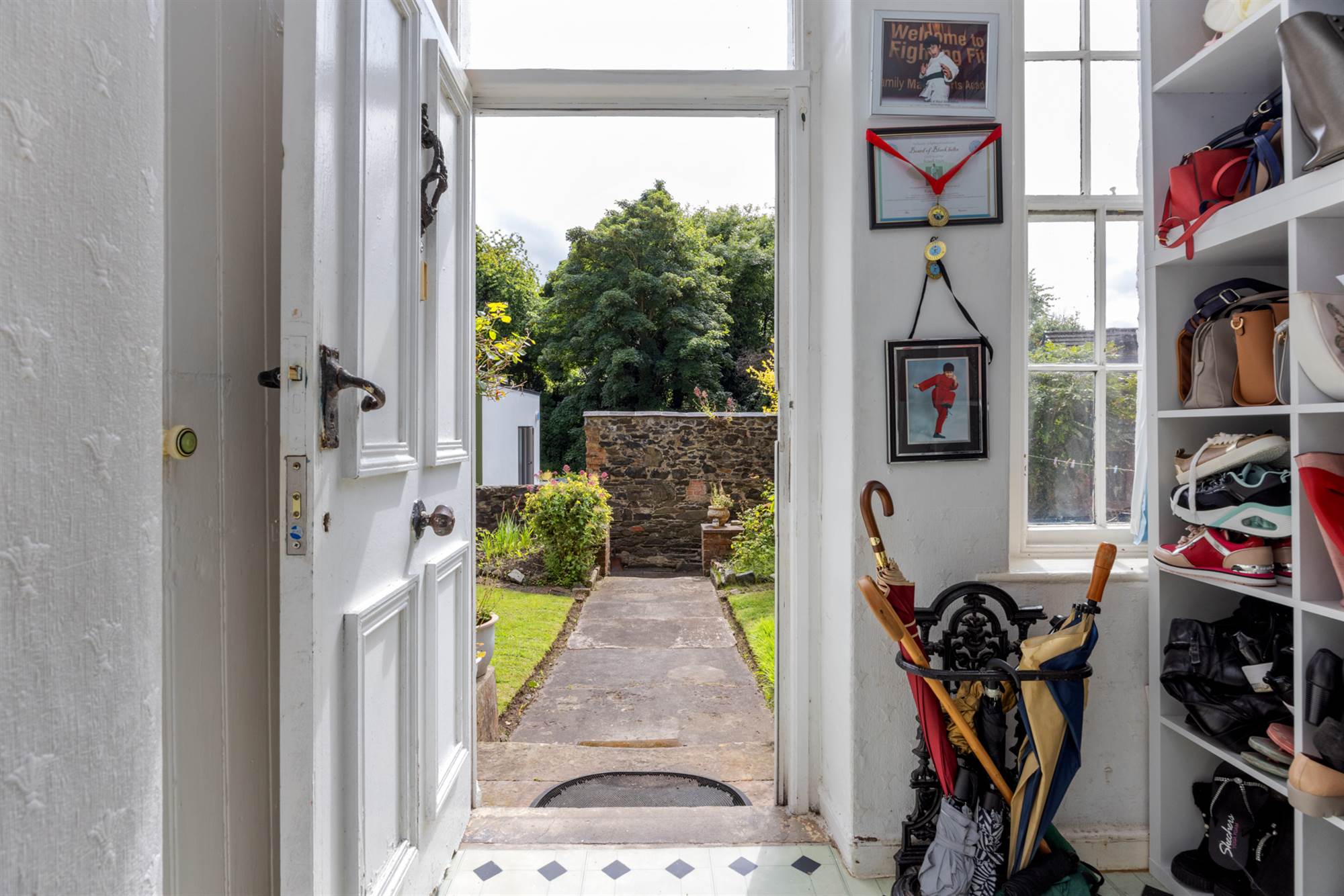 Under stairs storage, WC, hardwood panelled door to gardens.