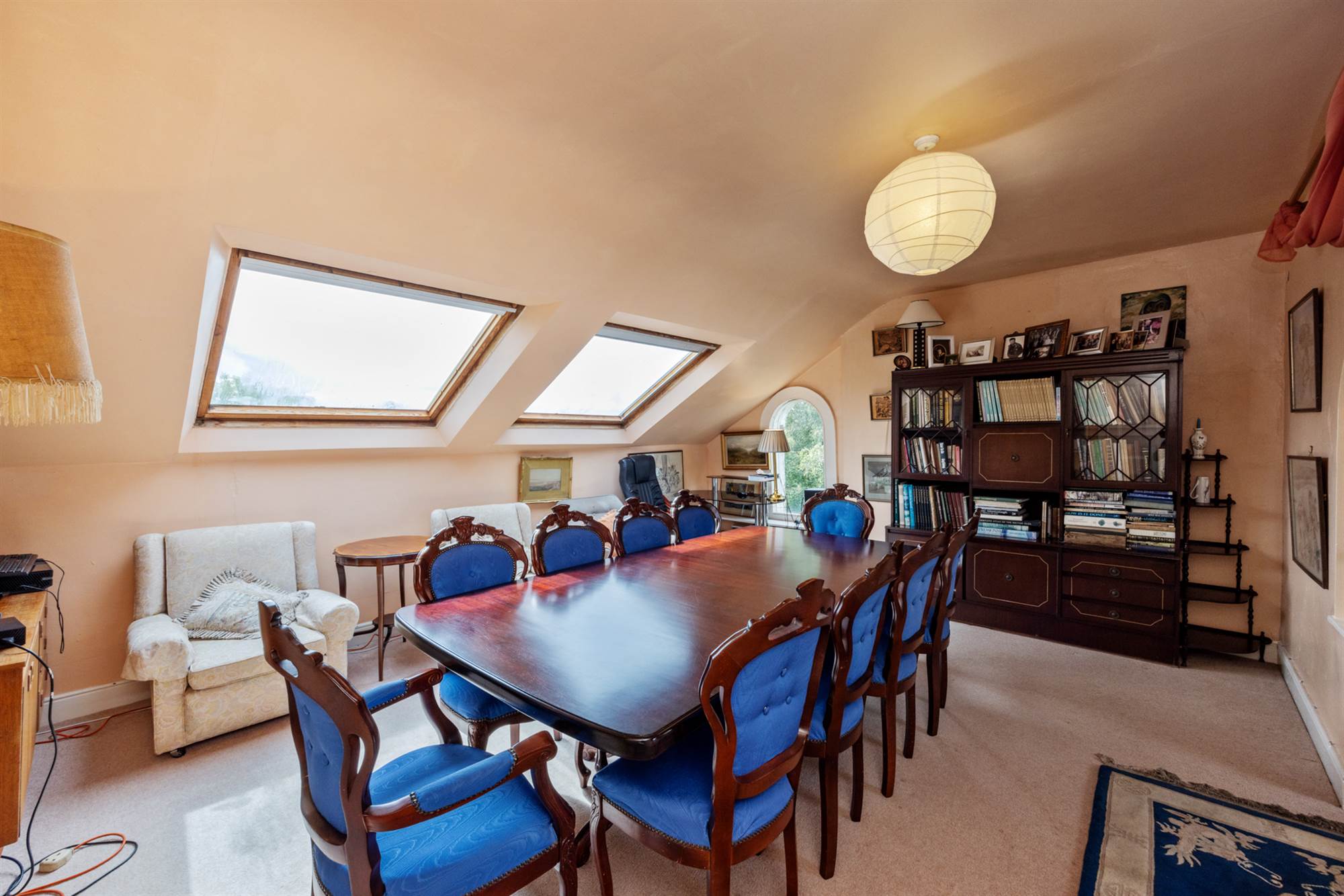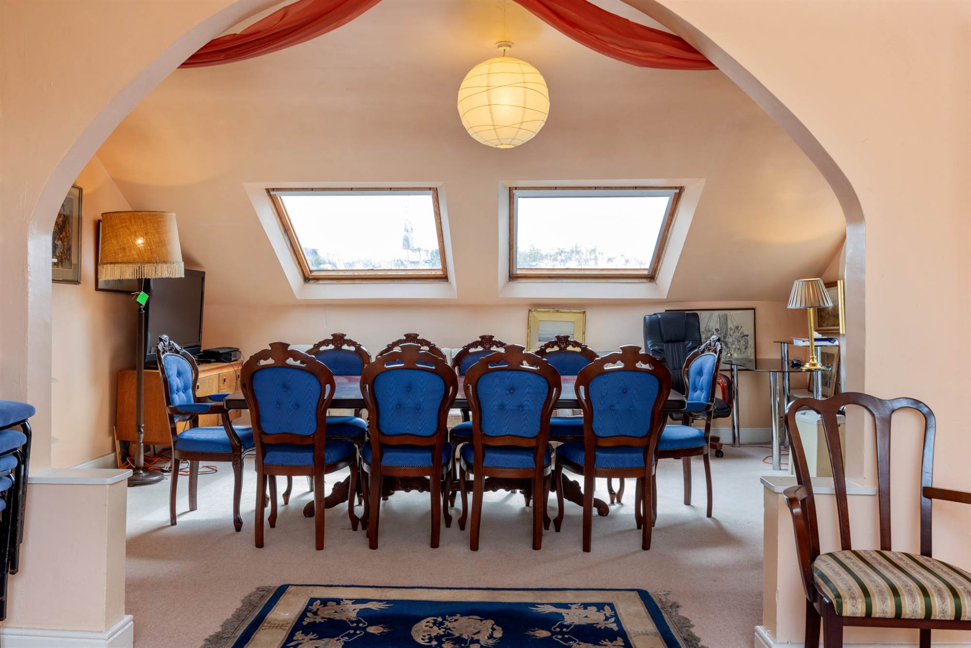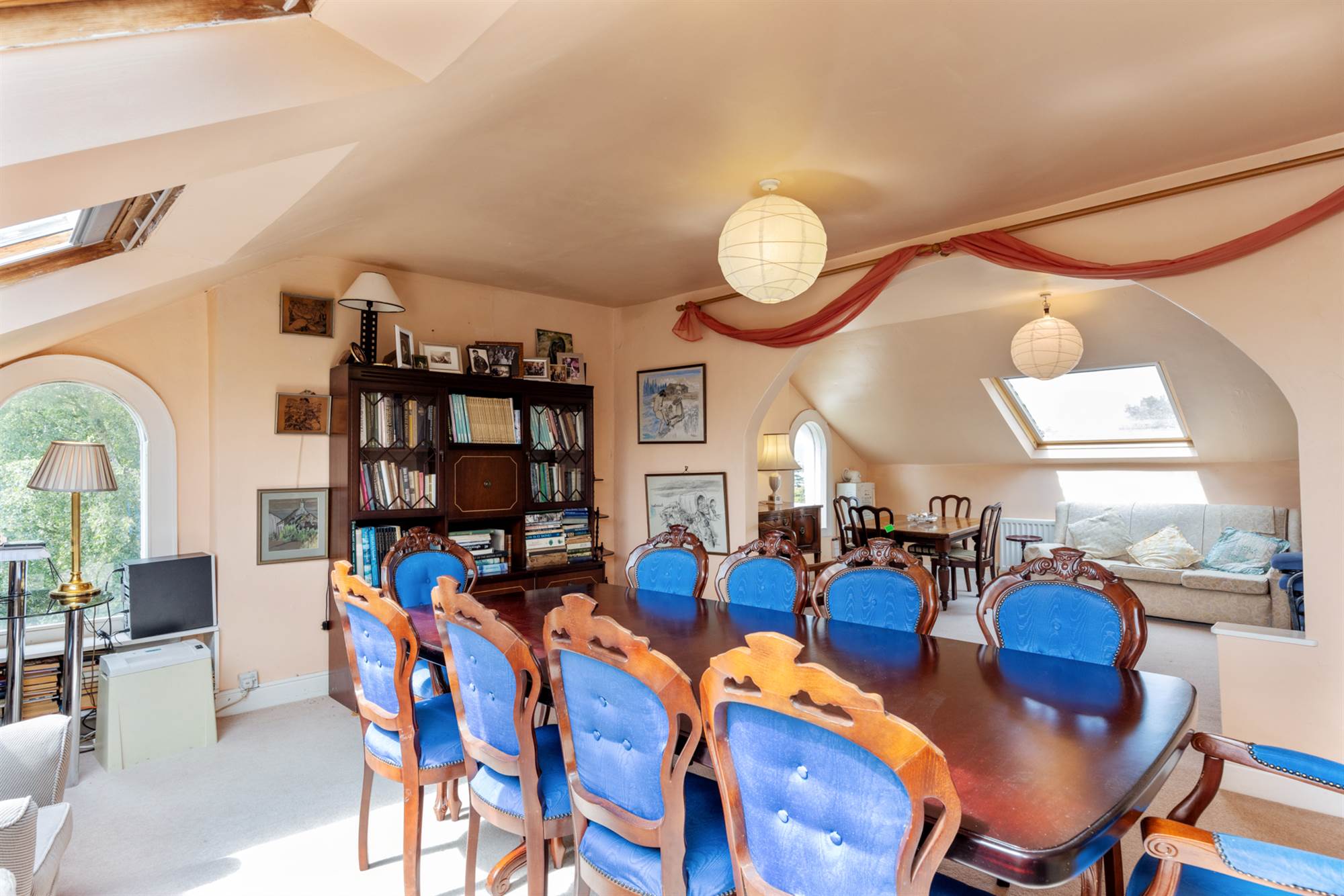 Open arch to Living Area. Velux window, feature arched window.