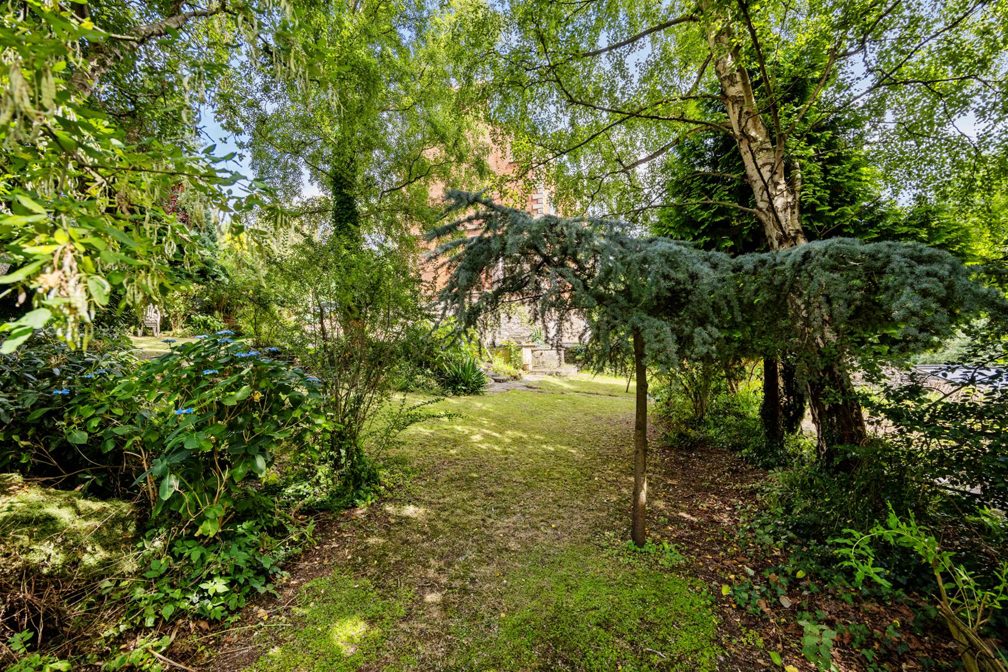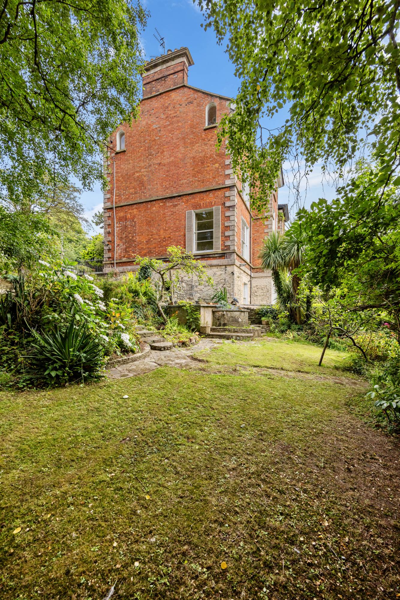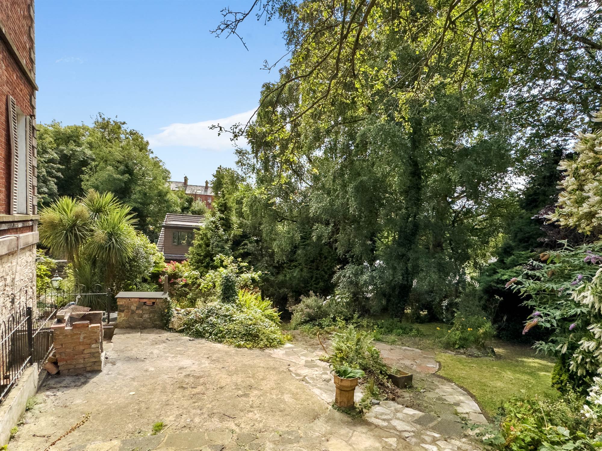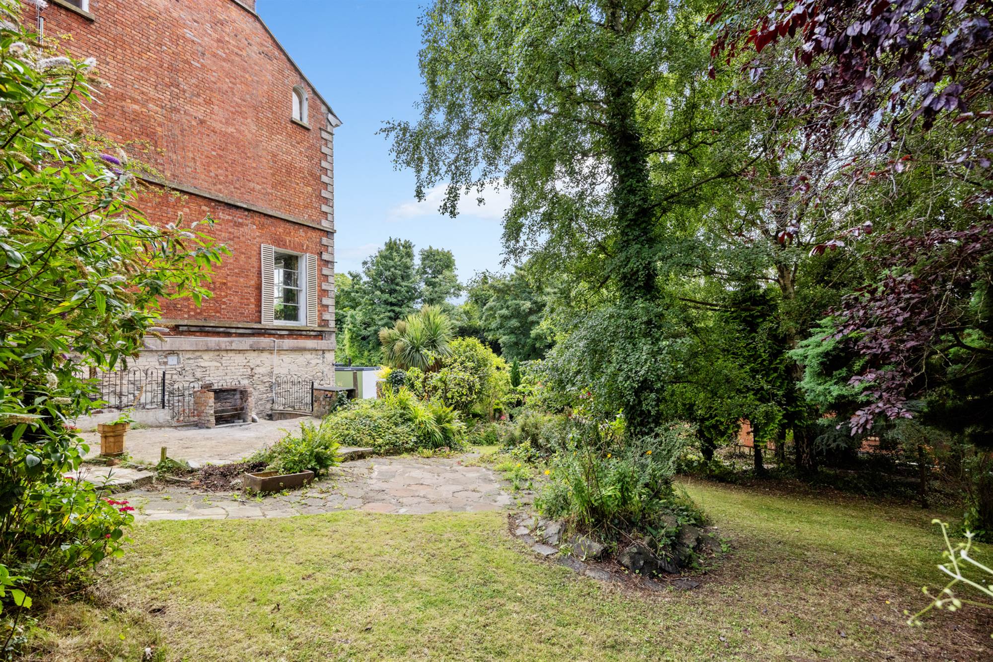 Gardens laid in lawns, feature pond, mature shrubs and hedges, paved area, paved paths weave through. Gates with access to Brook Street.