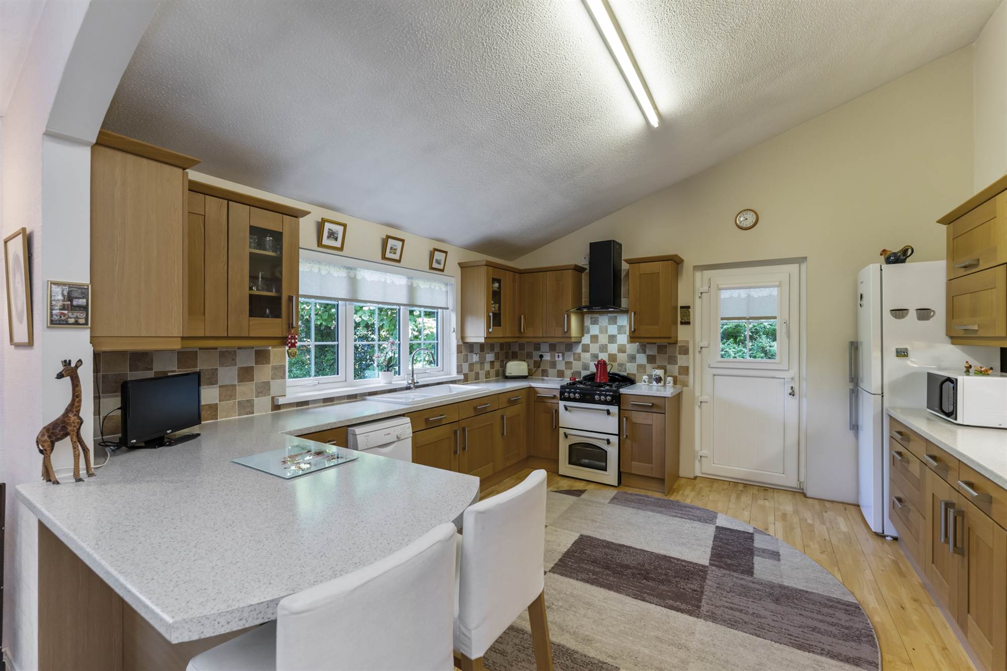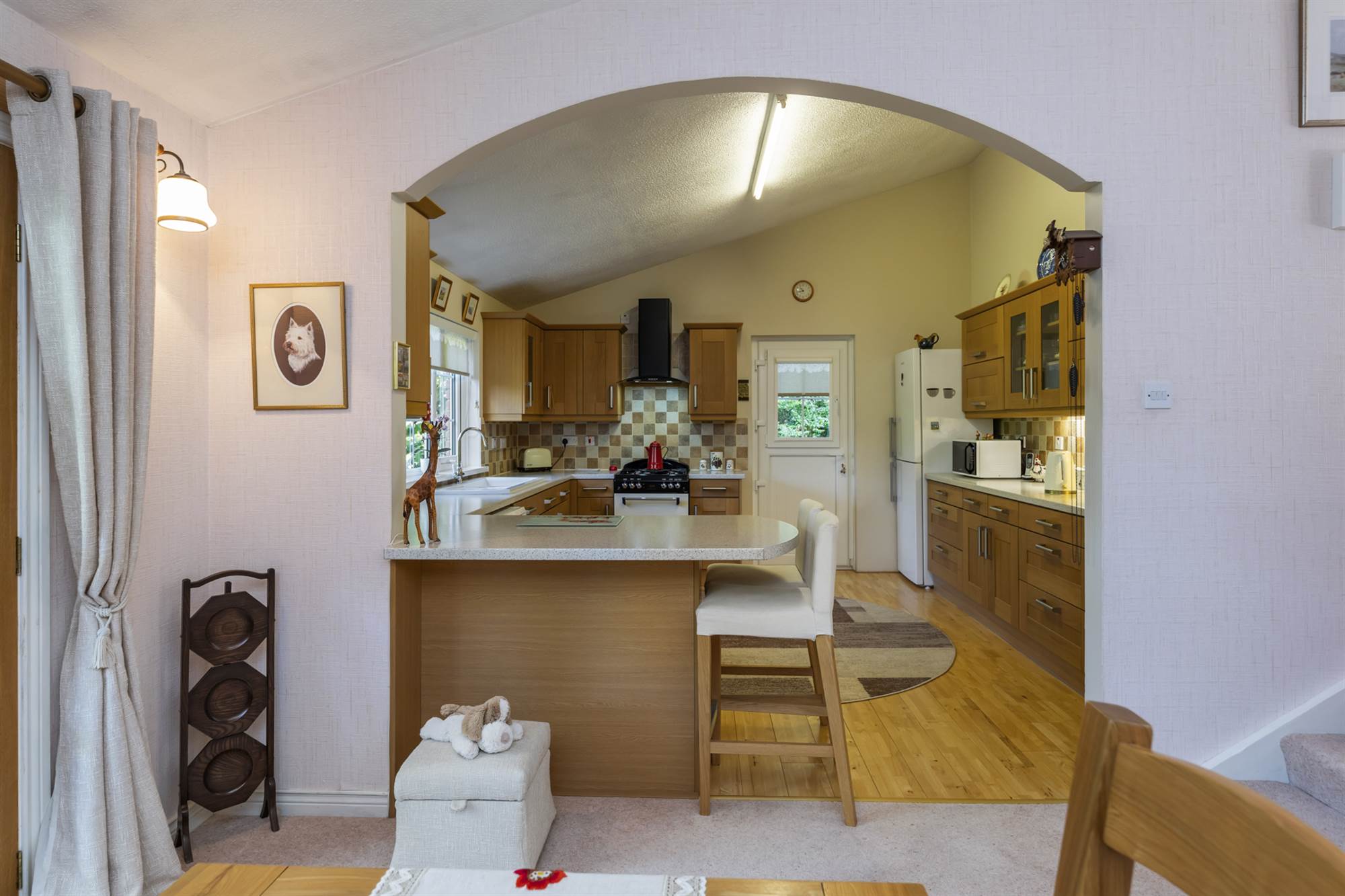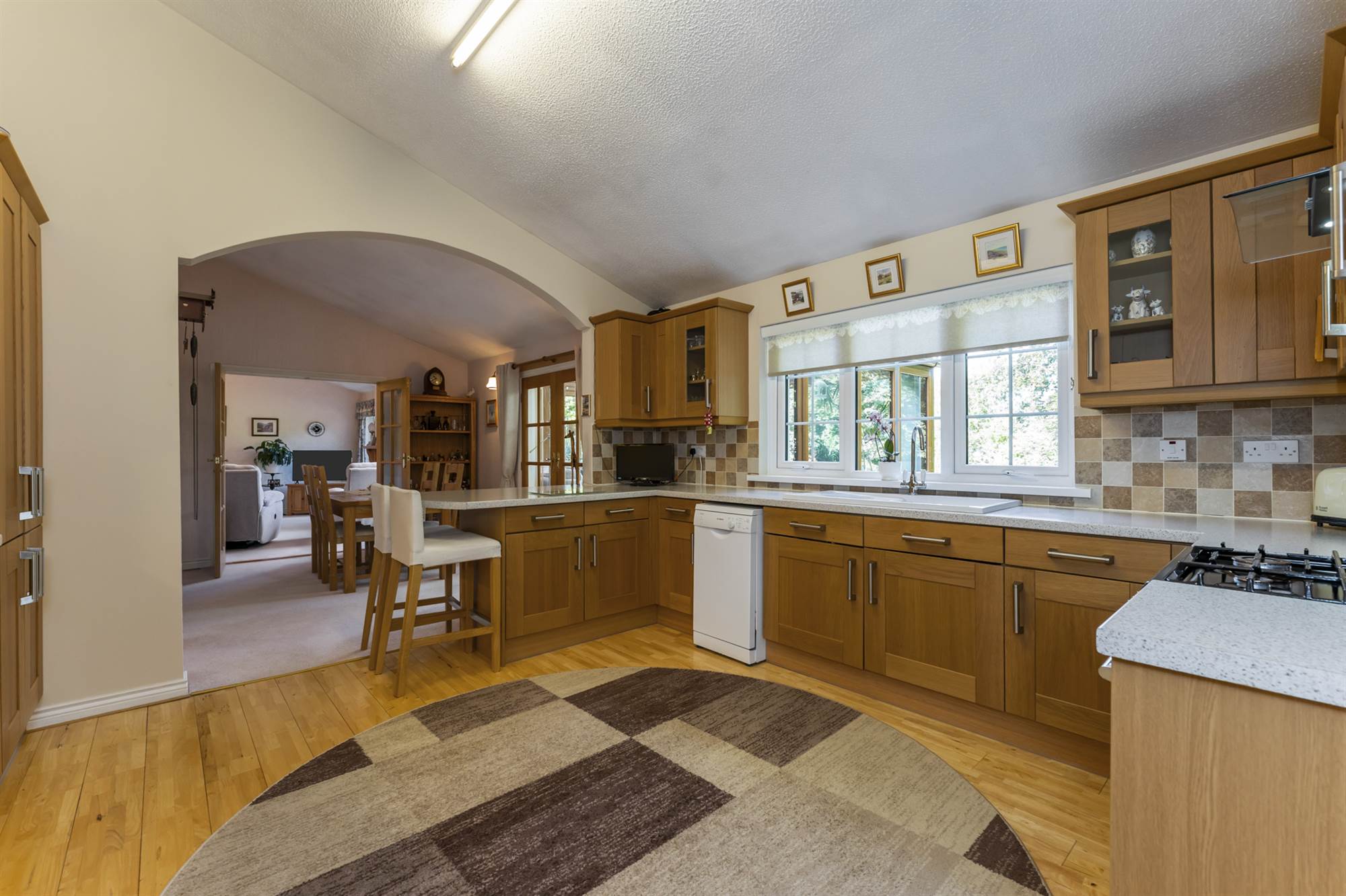 Excellent range of high and low level fitted units with breakfast bar dining, porcelain sink unit with mixer taps, recess for gas cooker, plumbed for dishwasher, recess for fridge freezer, PVC panelled door to side, wood laminate floor, open to Dining Area.