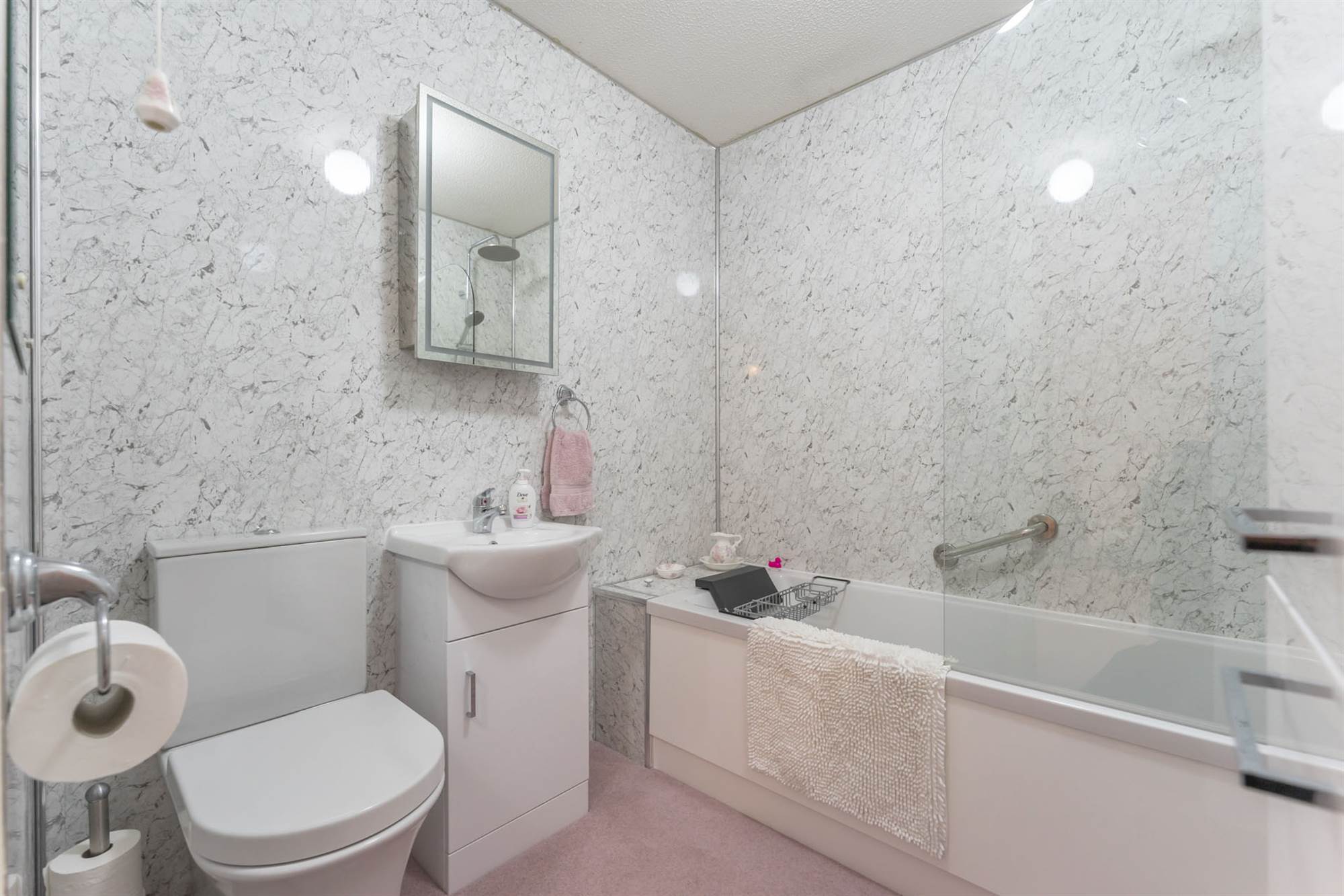Low flush WC, wash hand basin, panelled bath with mixer taps and shower fitments, heated towel radiator.