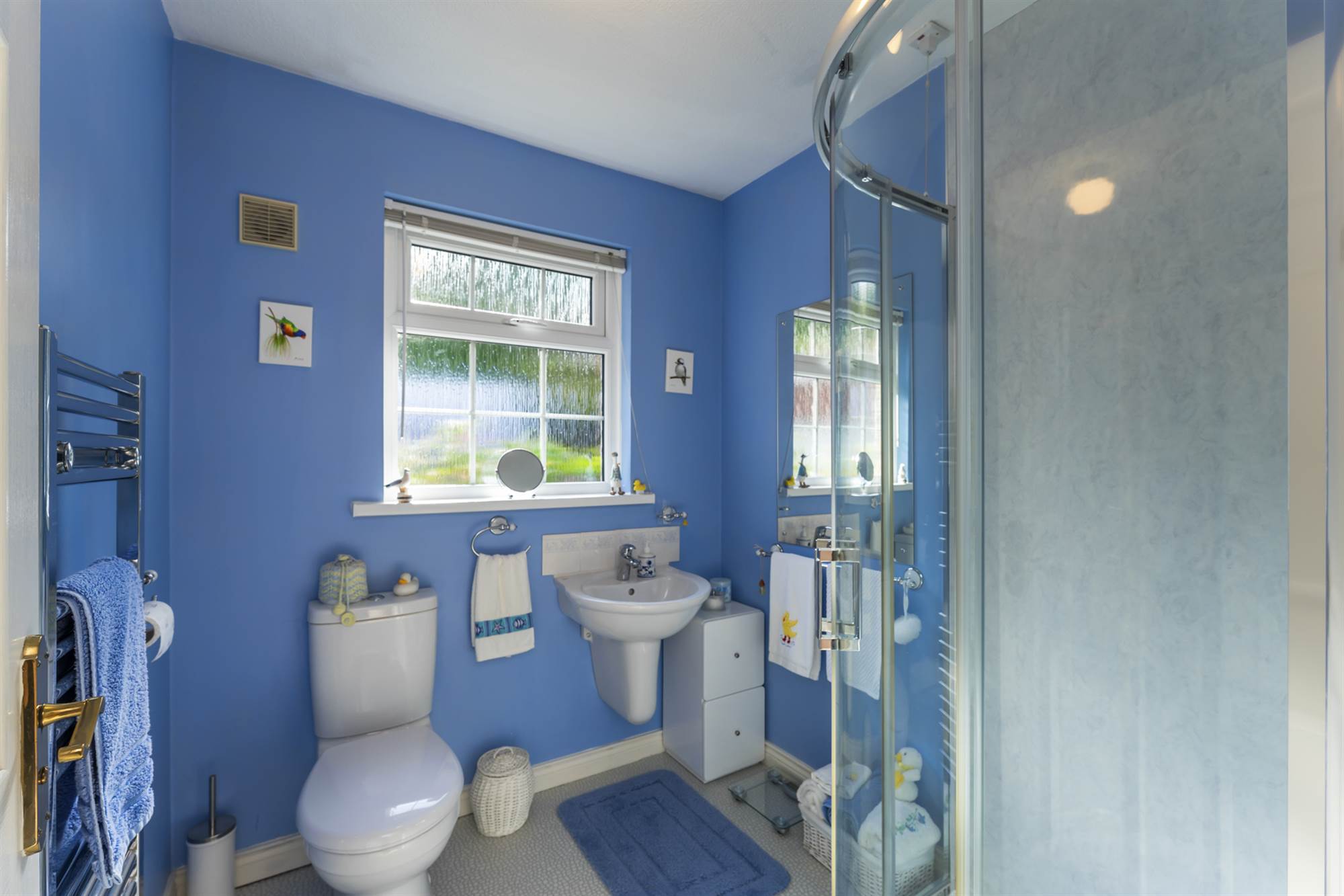 Low flush WC, wash hand basin, corner shower with 'Mira' instant heat electric shower, chrome heated towel radiator.