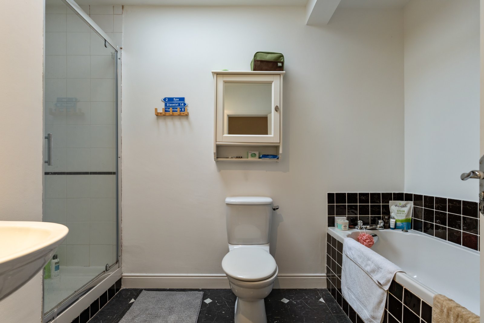 White suite comprising: Low flush WC, pedestal wash hand basin, tiled panelled bath with chrome mixer taps, separate fully tiled shower cubicle with thermostatic shower unit, skylight.