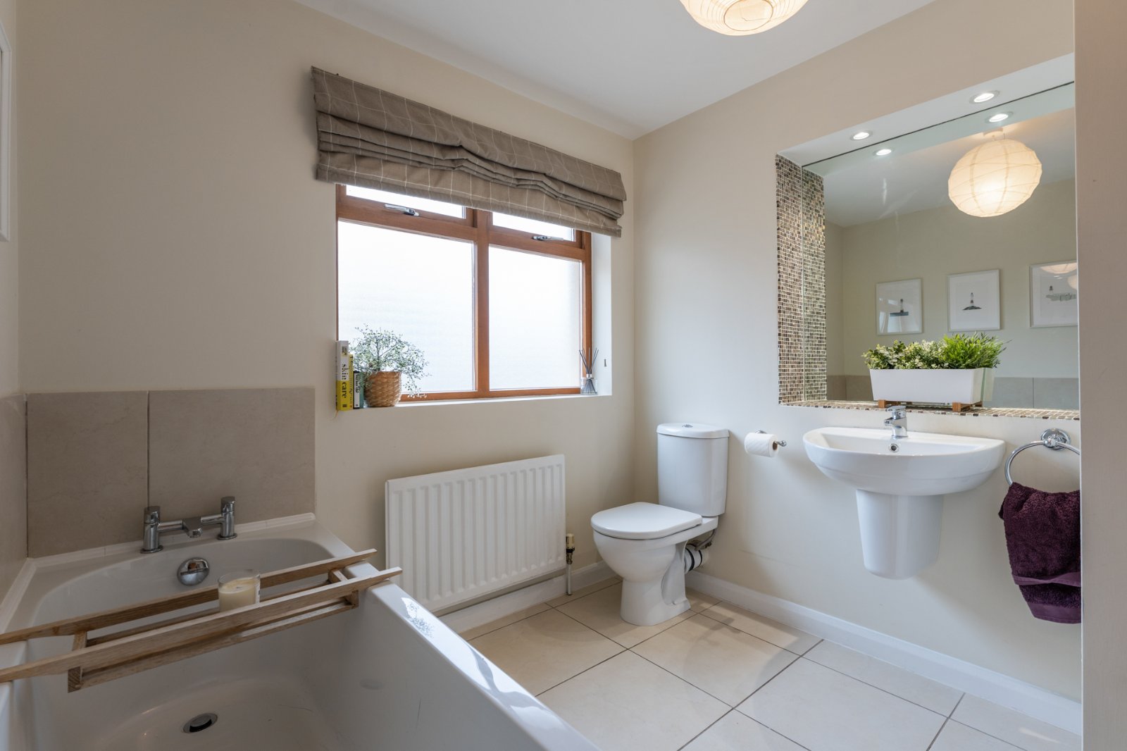 Contemporary suite comprising: Low flush WC, wash hand basin with feature mirror and lighting above, panelled bath with chrome mixer tap, fully tiled shower enclosure with chrome shower fitments, tiled floor, partly tiled walls.
