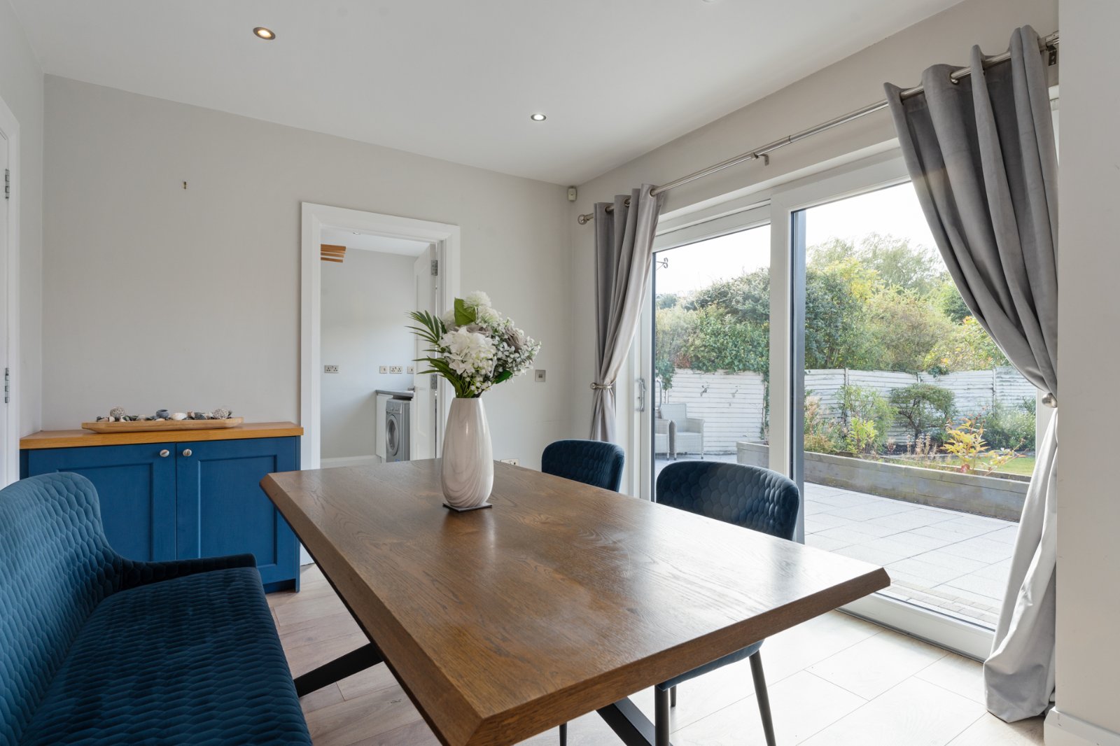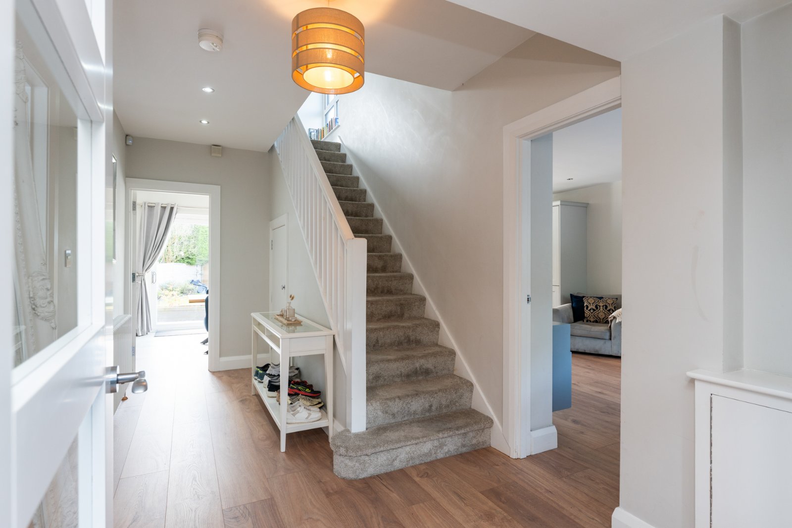 At widest points. Glazed double door to glazed double doors to entrance porch, recessed lighting, engineered wood flooring, storage under stairs.