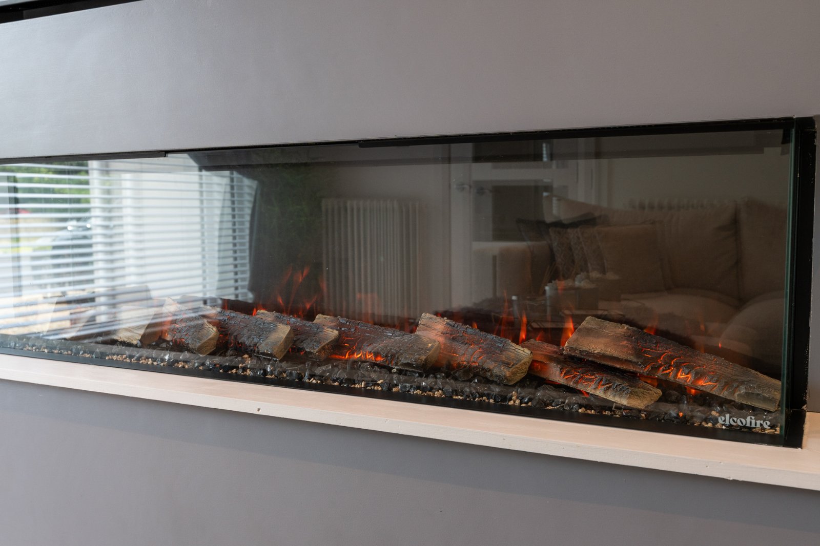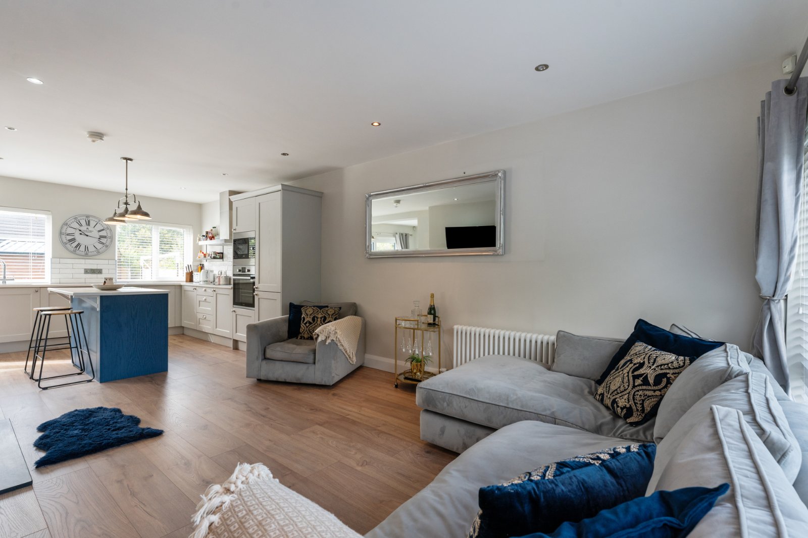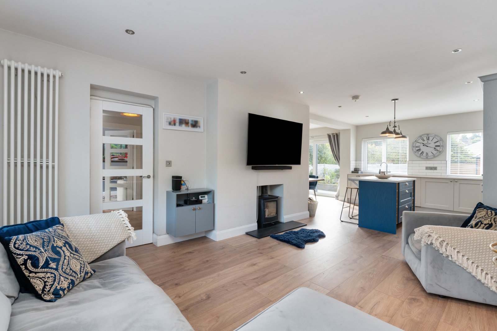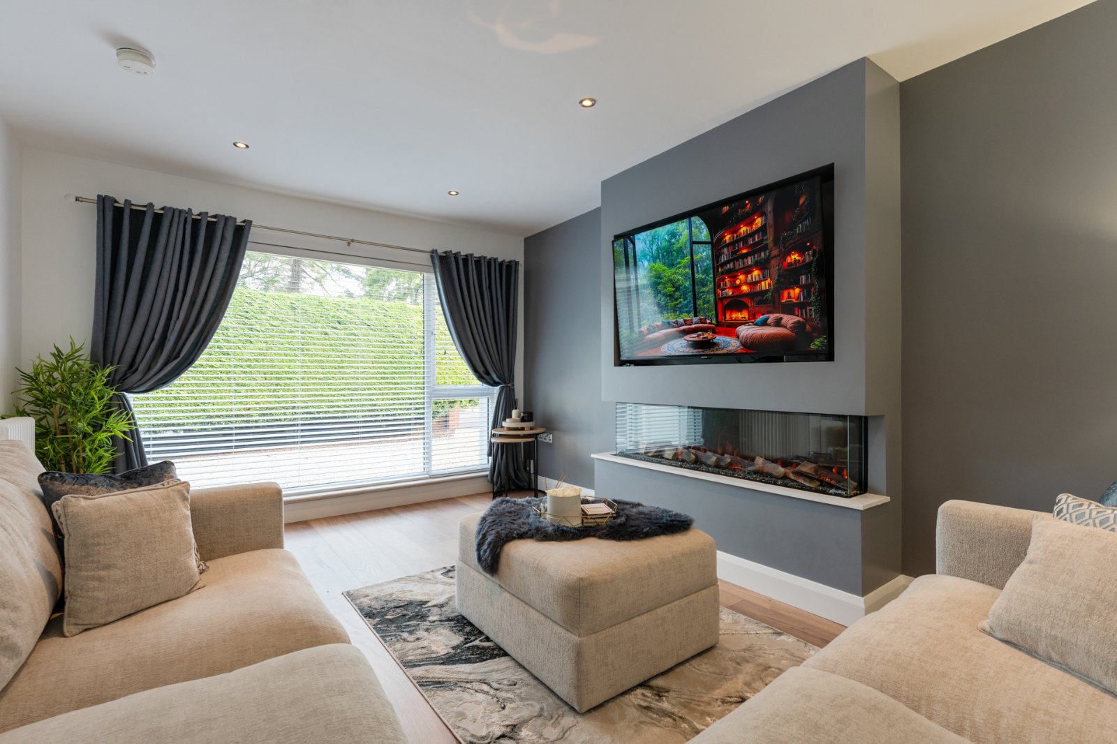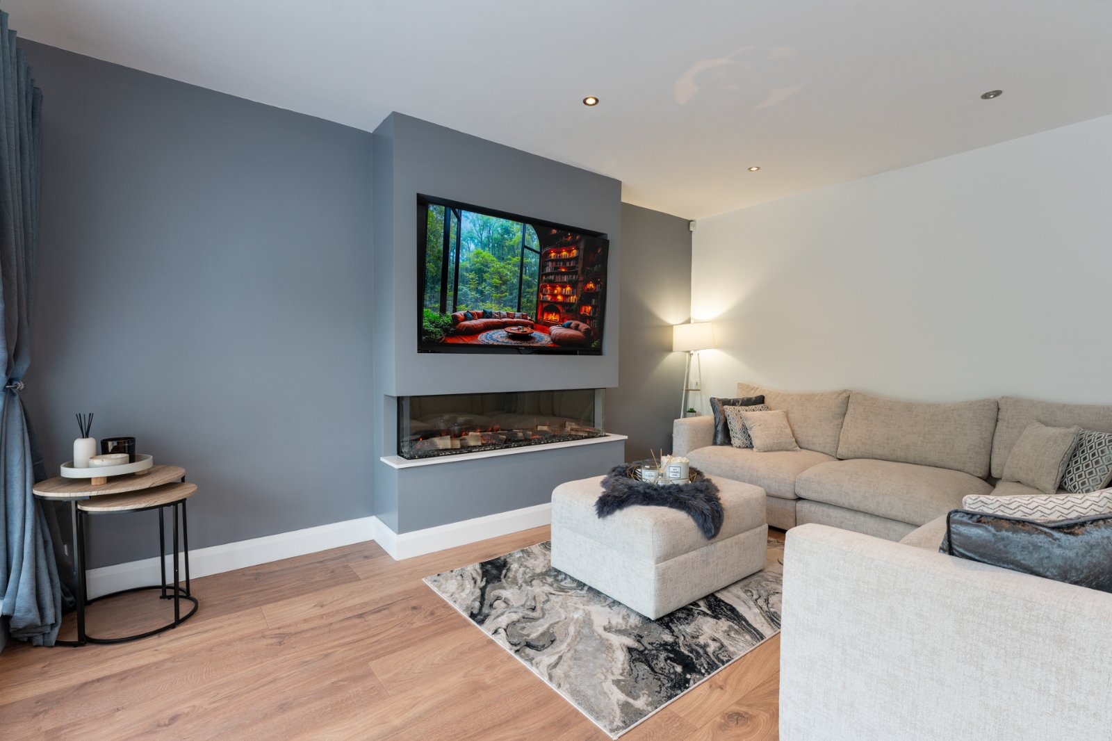 Media wall with electric fire, engineered wood flooring, recessed lighting.