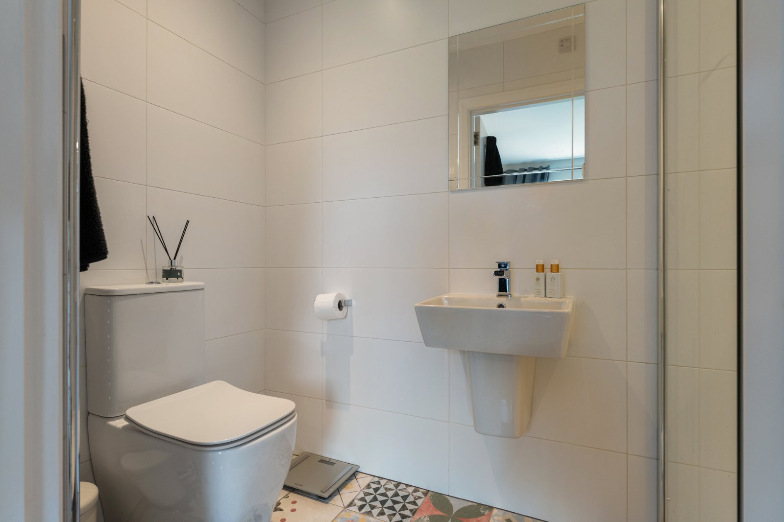 Fully tiled shower cubicle with thermostatic shower unit, semi pedestal sink with mixer taps, low flush WC, fully tiled walls, ceramic tiled floor, extractor fan, recessed lighting.