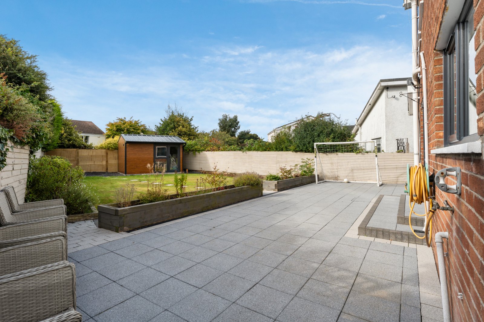 Dual entrance stone driveway. Enclosed southly facing garden to rear with patio area, perfect for entertaining and fence boundary with raised flowerbeds, gardens in lawn.