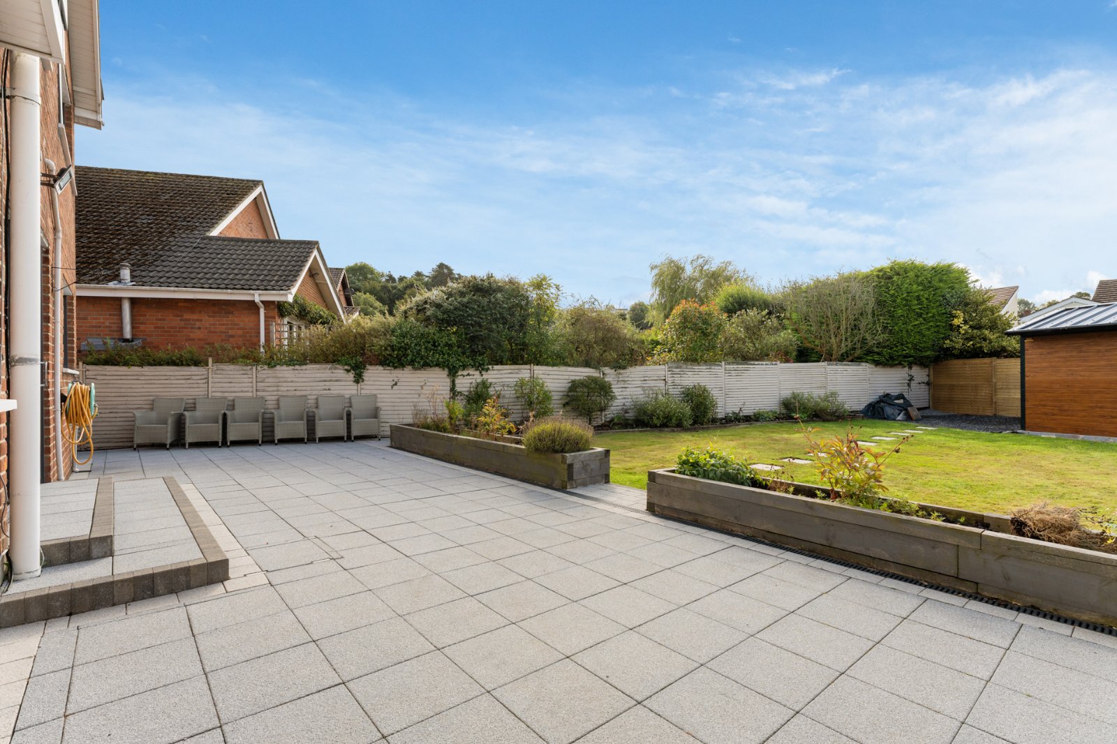 Set on a private site with a dual entrance stone driveway, ample parking, and a new home office. To the rear, enjoy a large, entertaining patio and south facing garden laid in lawns.