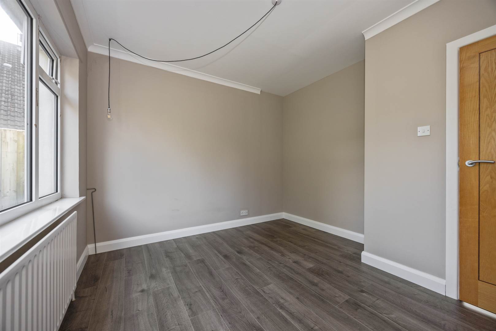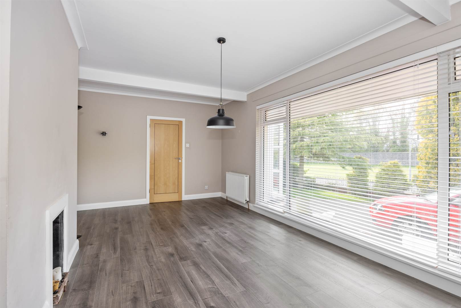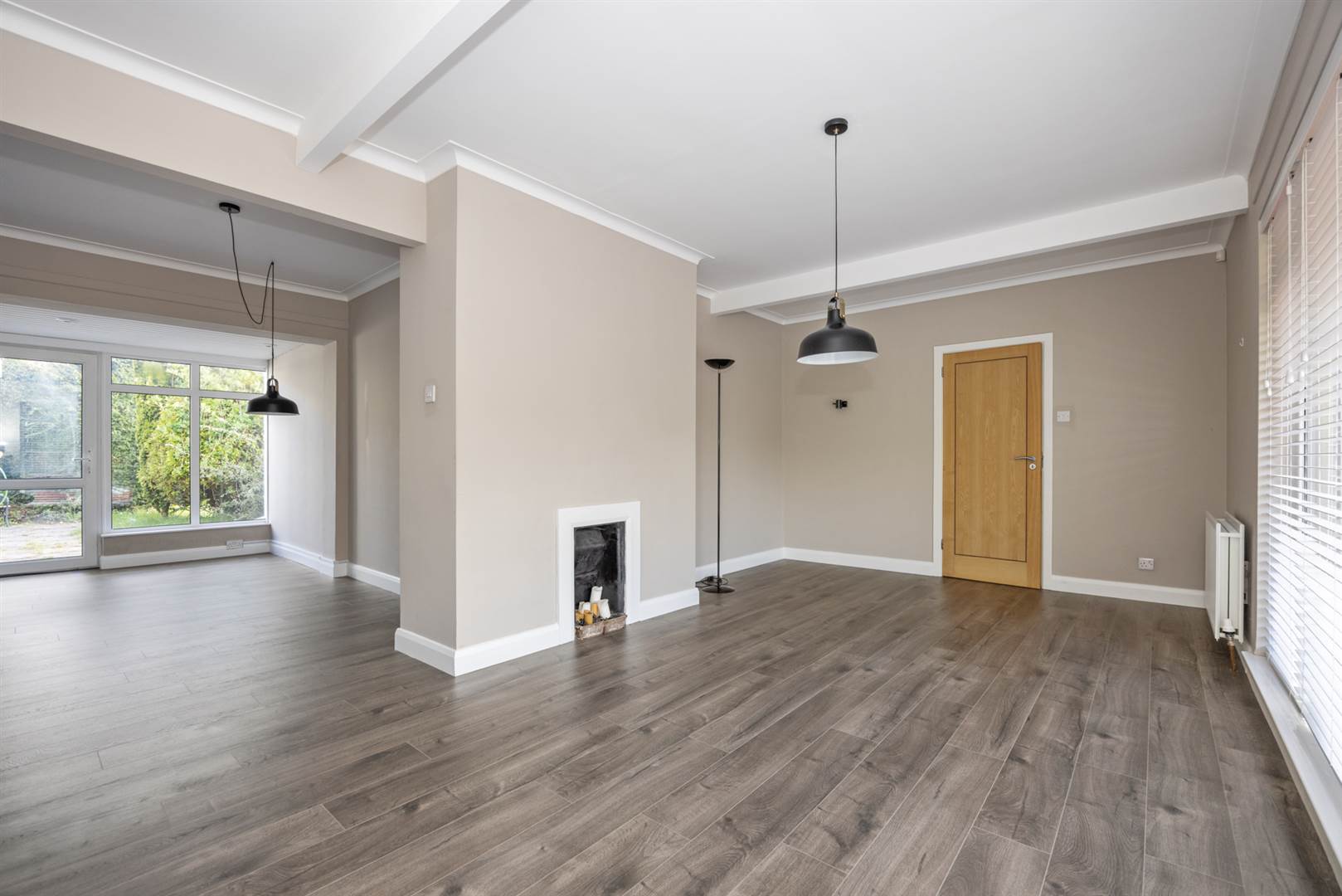 Grey ash effect laminate flooring, large picture window with attractive open outlook, former fireplace (chimney capped but could be reopened). Leading to: