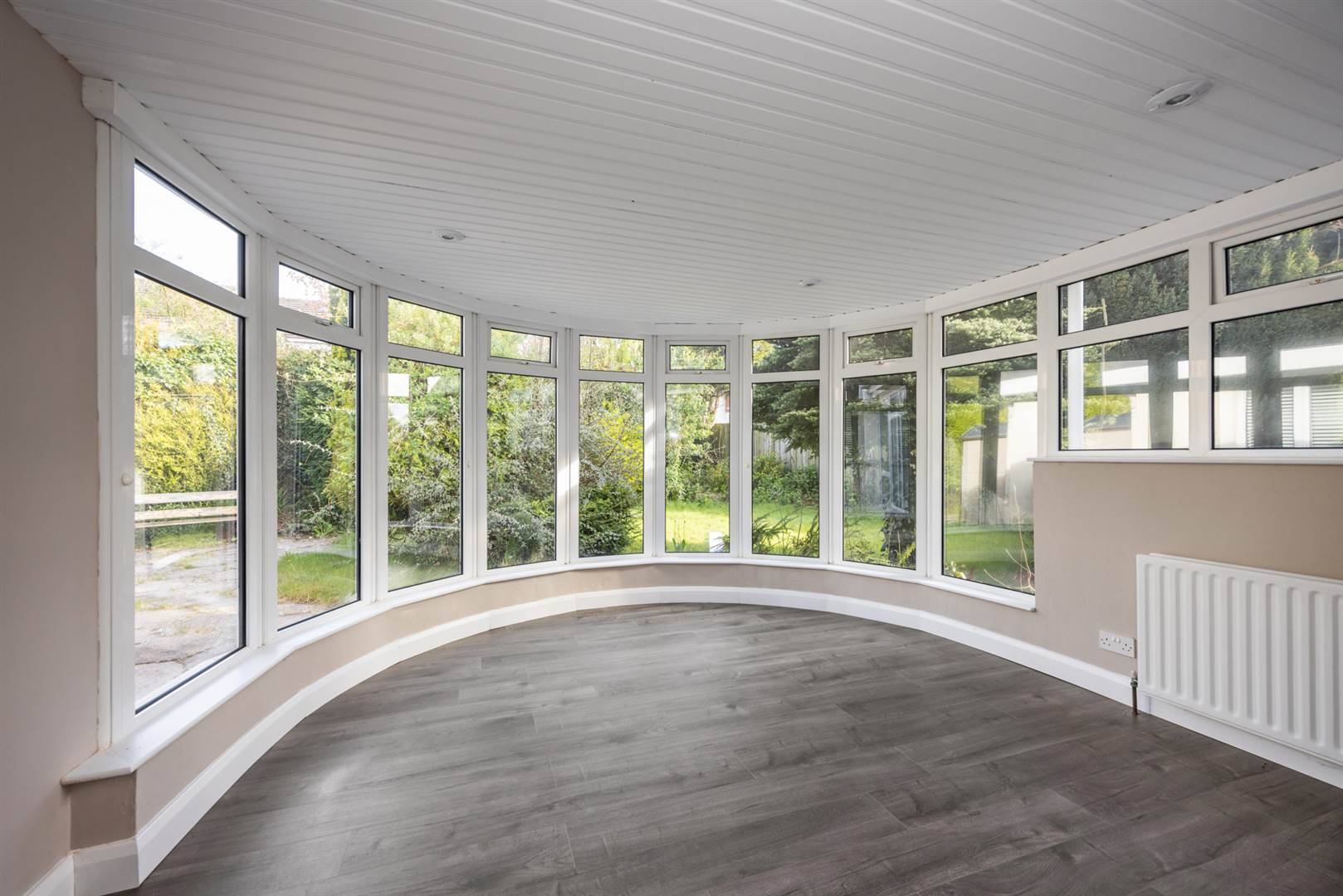 Grey ash effect laminate flooring, Upvc double glazed semi circular windows looking into rear garden.