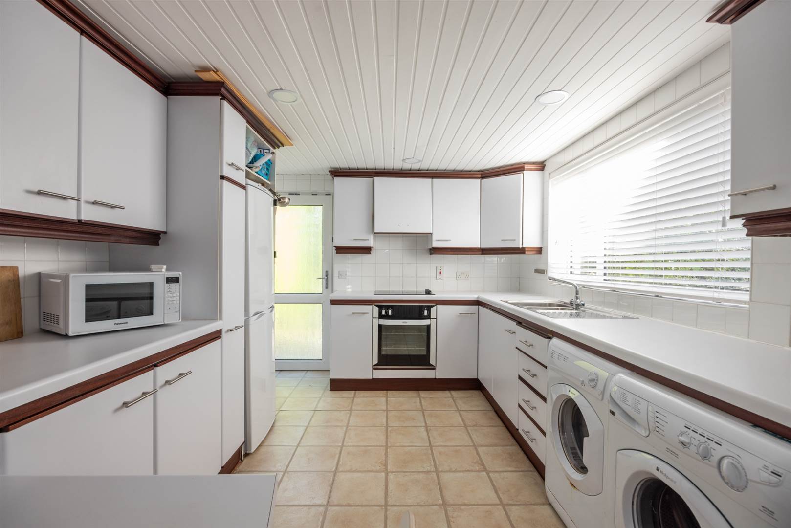 Extensive range of white laminate high and low level cupboards, white roll top worktops, inset 11/2 tub single drainer stainless steel sink unit, mixer taps, vinyl floor, tiled walls, painted tongue and groove ceiling, breakfast table, Belling under oven, four ring ceramic hob, cooker hood / extractor, Hotpoint fridge and freezer, plumbed for washing machine and space for tumble drier. uPVC double glazed door to patio and rear garden.