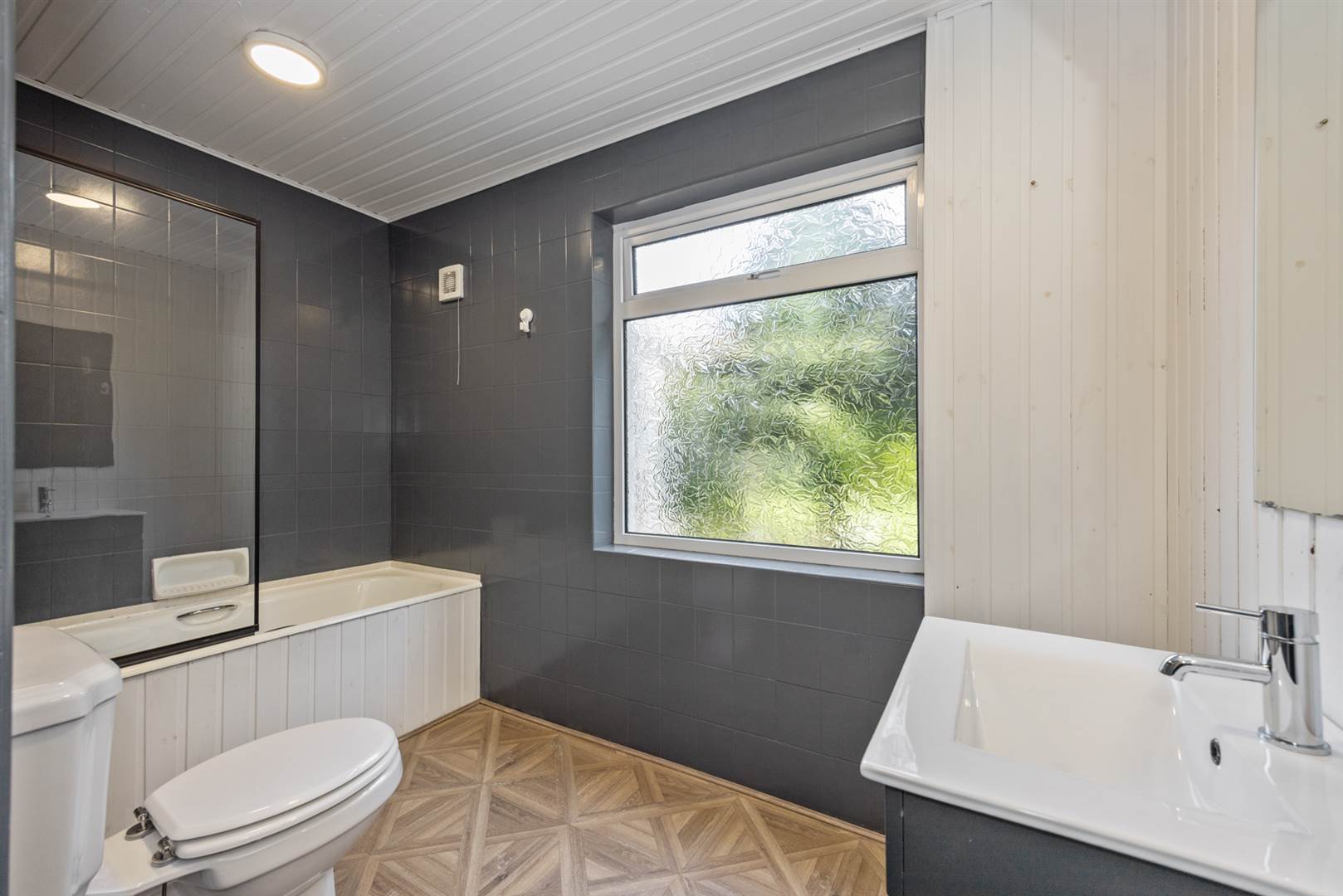 (max) White suite comprising; tongue and groove panelled bath, mixer taps, telephone hand shower, extractor, painted tiled walls, low flush wc., vanity unit with wash hand basin, painted tongue and groove panelled ceiling, vinyl flooring.