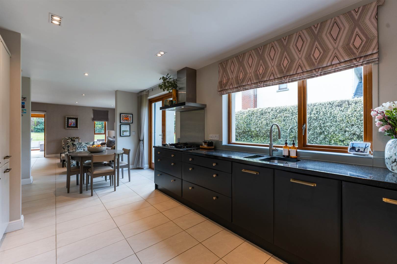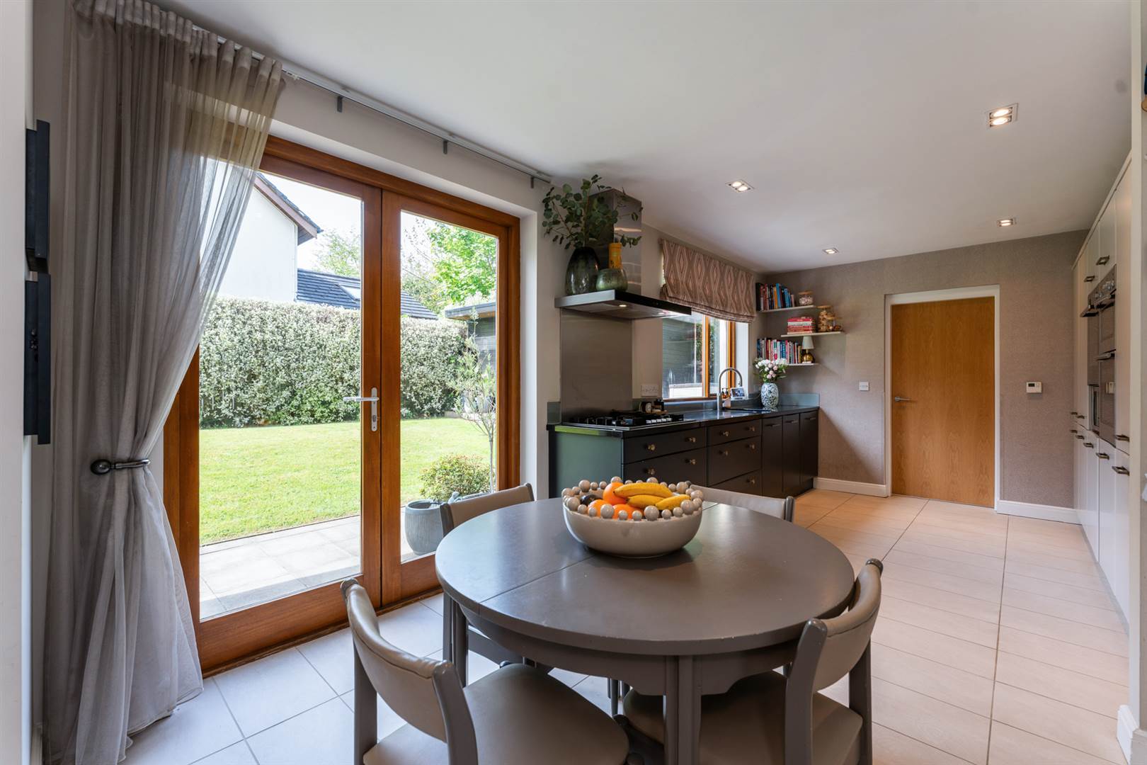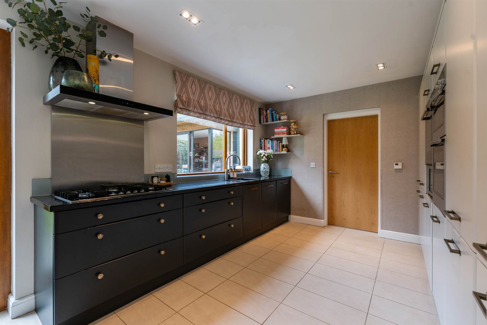 Extensive range of beige neutral and off black cupboards, polished granite worktops, inset one and a half tub stainless steel sink unit with mixer tap, Quooker hot tap, dishwasher, integrated fridge, freezer, Neff stainless steel eye level double ovens, Miele five ring gas ceramic hob, stainless steel splashback, stainless steel cooker canopy, recessed lighting, space for breakfast table and chairs, double French doors to garden, door to: