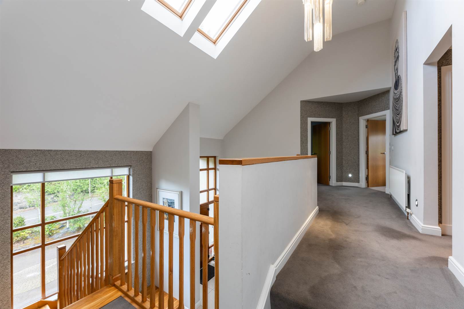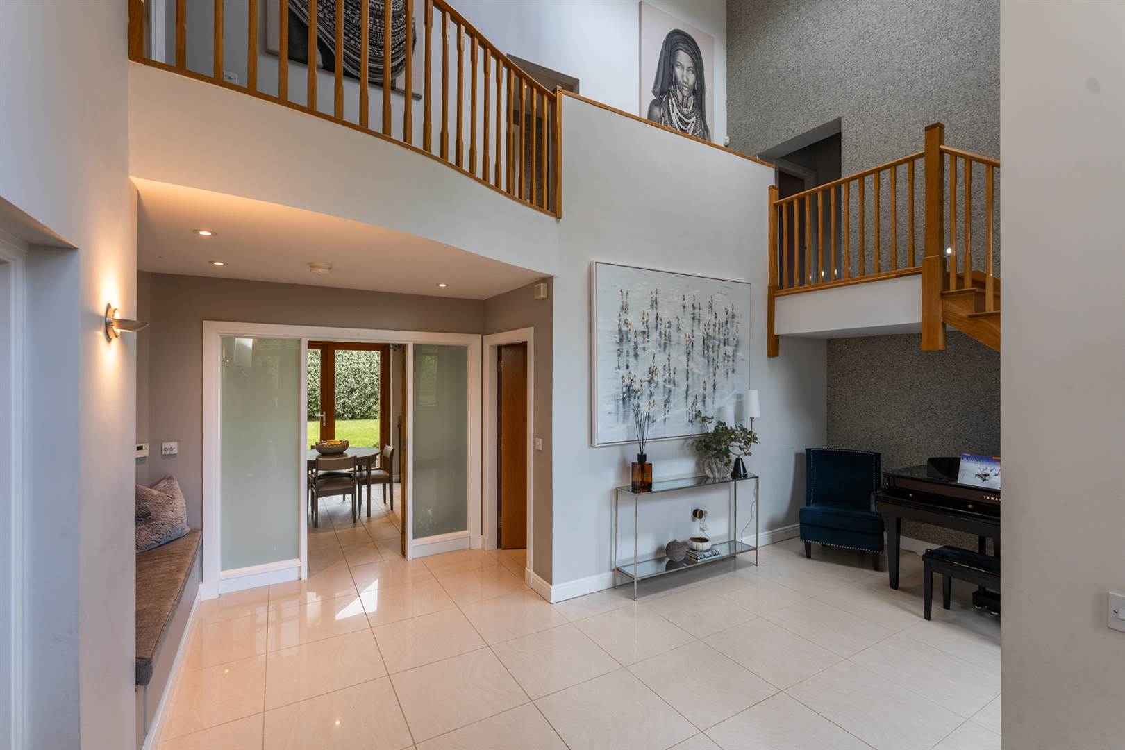 Feature oak staircase with recessed tread lighting to first floor, Minstrel gallery overlooking hall.