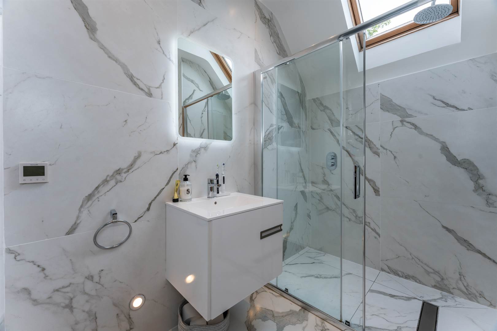 Wc with concealed cistern, floating vanity unit, wash hand basin, recessed lighting, built-in display shelving with mirror back, chrome heated towel radiator, extractor fan, tiled heated floor, large shower cubicle with drench shower, double glazed Velux window. Also, low level lighting.