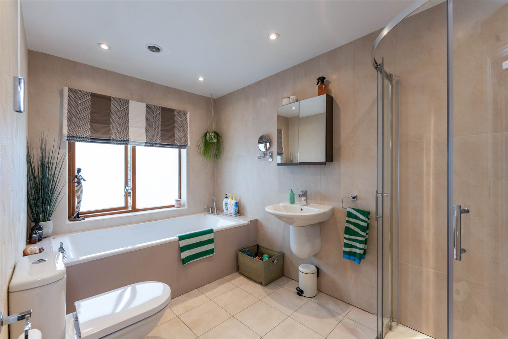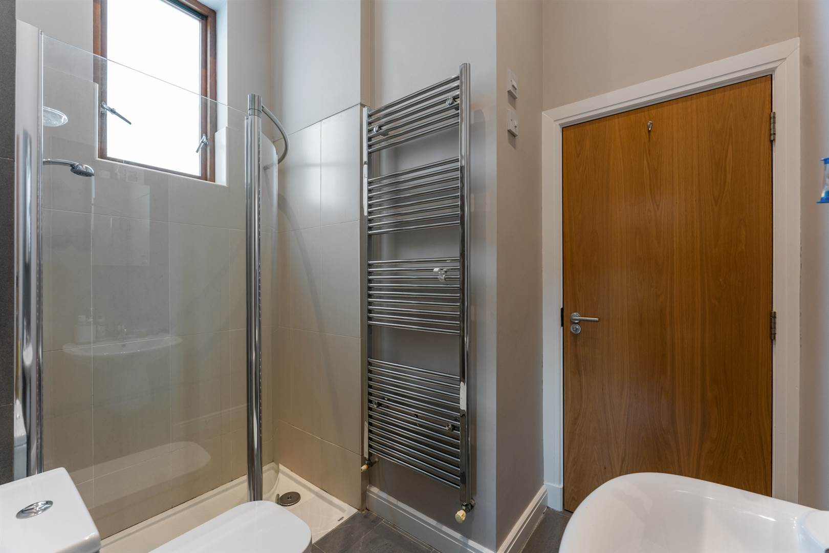 Low flush wc, floating wash hand basin, panelled bath with mixer tap, telephone hand shower, tiled floor, fully tiled corner shower cubicle, Mira Sport instant heat shower, chrome heated towel radiator, recessed lighting, extractor fan,