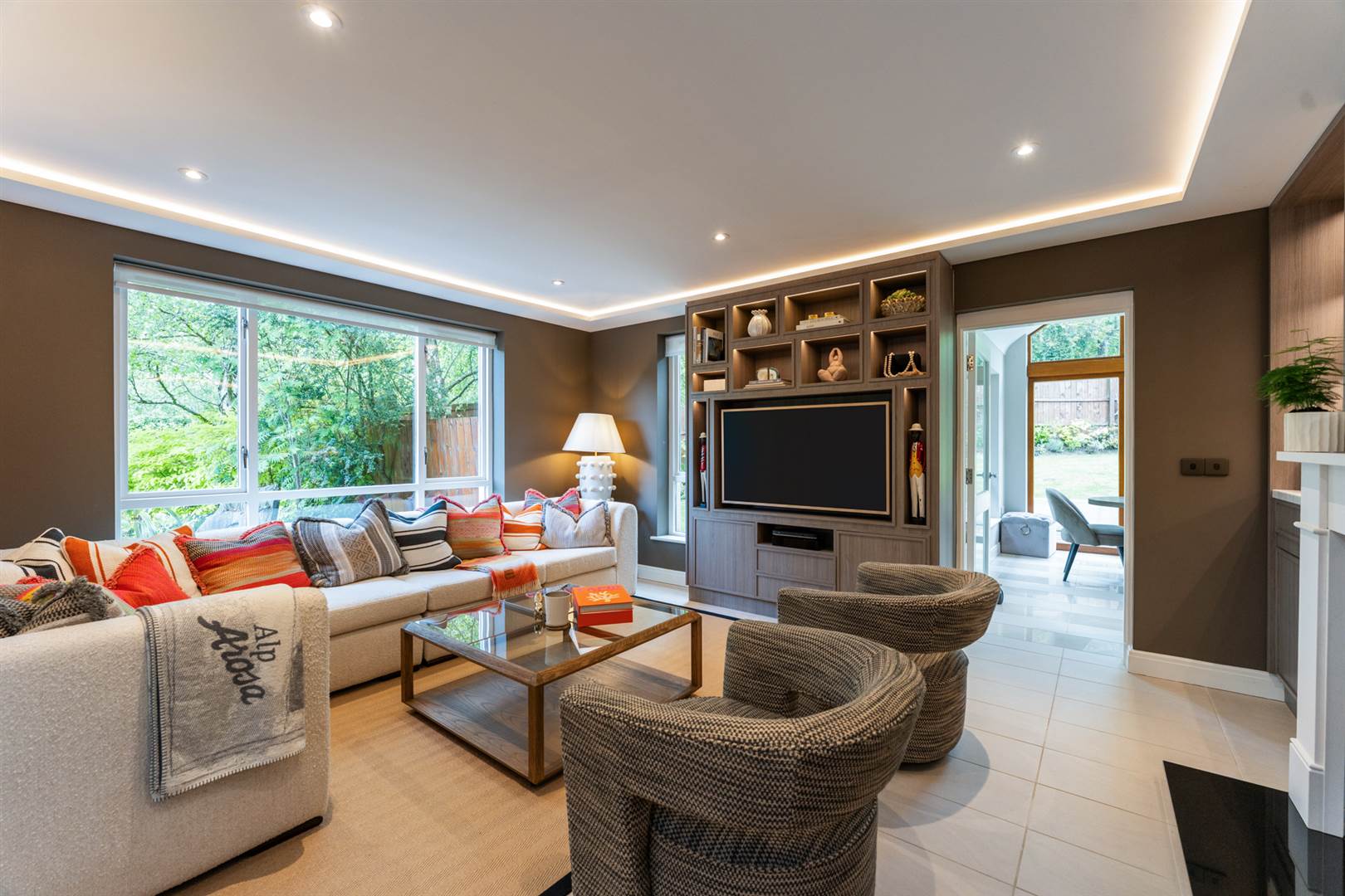 Feature contemporary gas fire, stone surround, polished granite hearth, built-in cupboards, display shelving with mirror behind, built-in entertainment unit, display shelving and built-in cupboards, recessed lighting, concealed lighting, double glazed opaque glazed doors to hall, opaque glass door to: