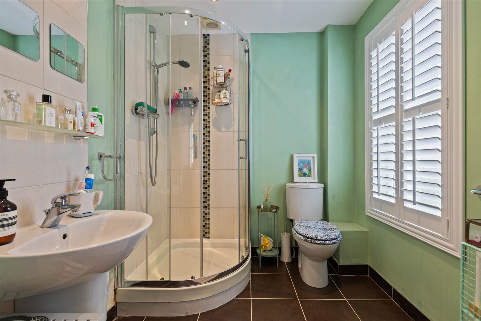 Fully tiled shower cubicle with thermostatically controlled shower unit, low flush wc, wall mounted wash hand basin with tiled splash back, mixer tap. Ceramic tiled floor. Low voltage lighting. Plantation shutters.
