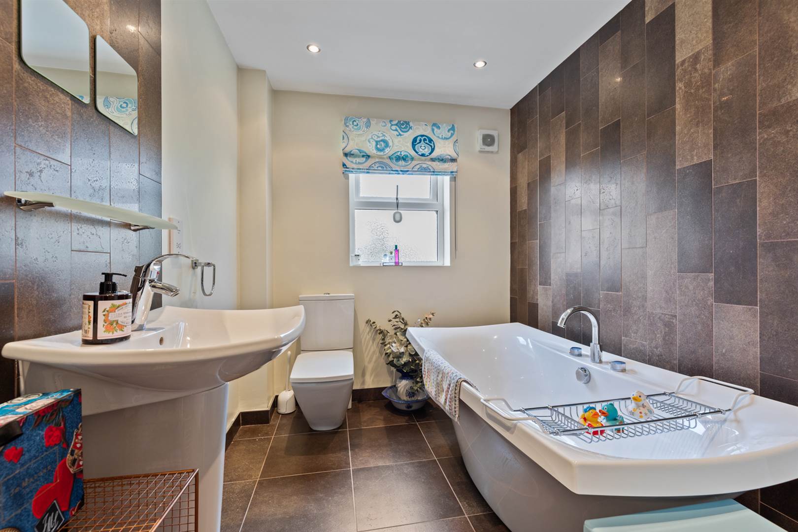 Luxury suite comprising free standing bath with swan neck tap, low flush wc, pedestal wash hand basin with mixer taps. Floor to ceiling tiled splash back. Ceramic tiled floor. Feature tiled wall, low voltage lighting, hotpress with insulated copper cylinder and shelving.