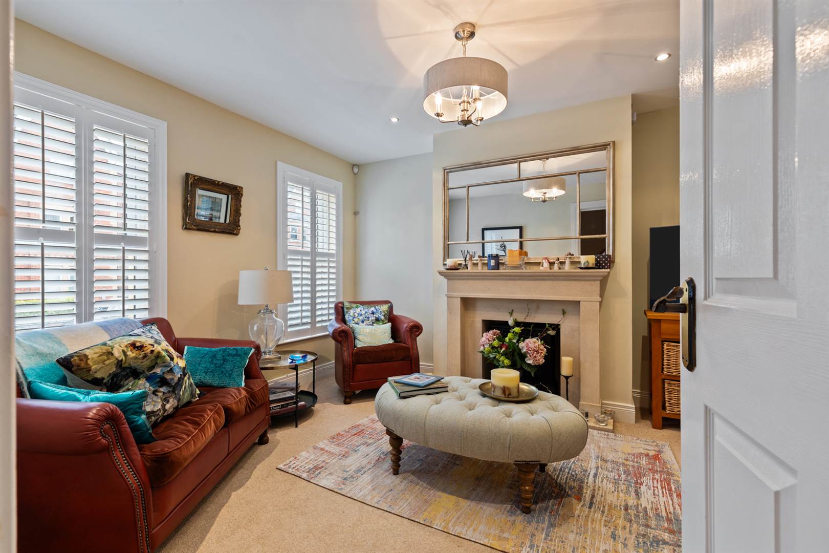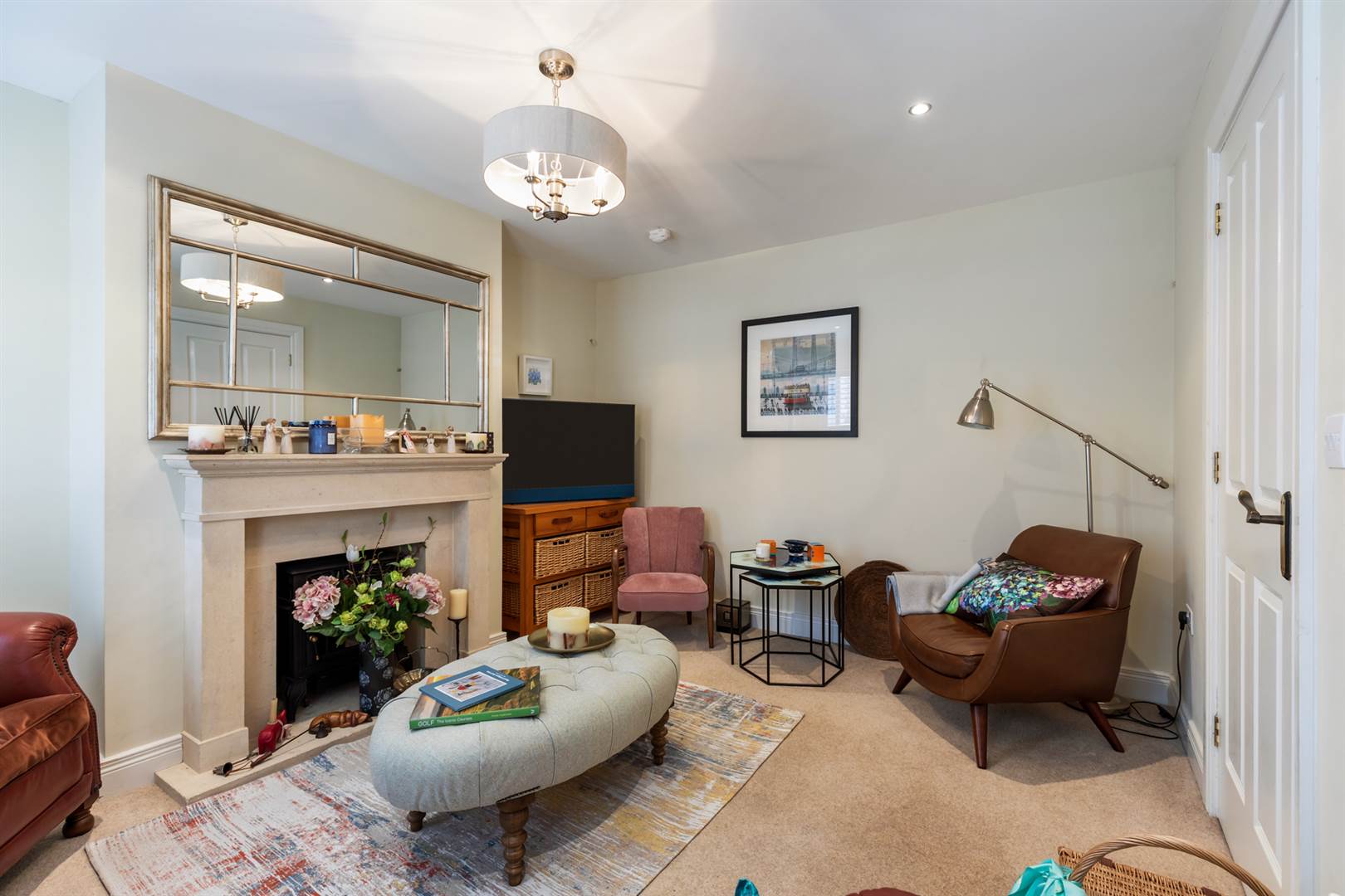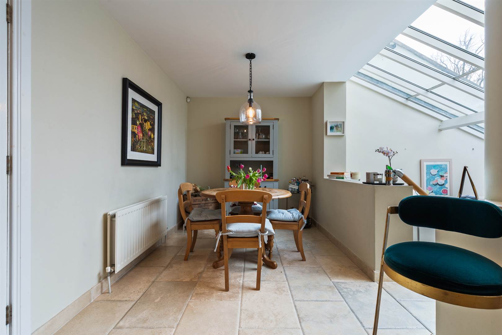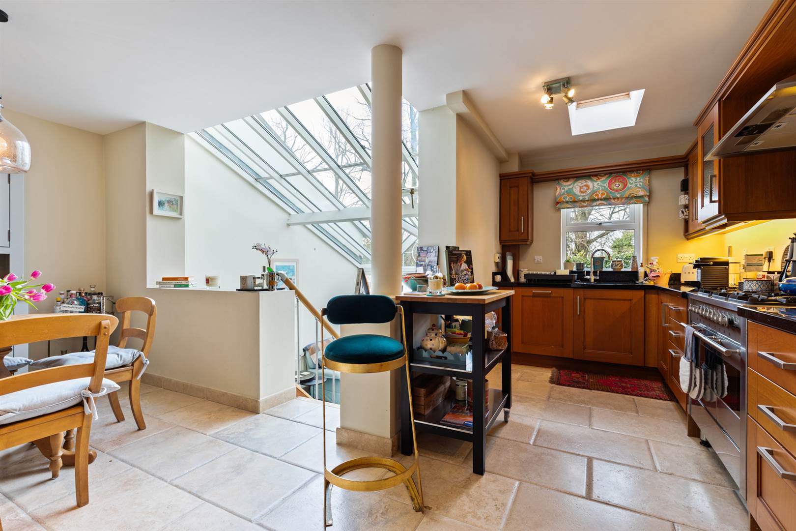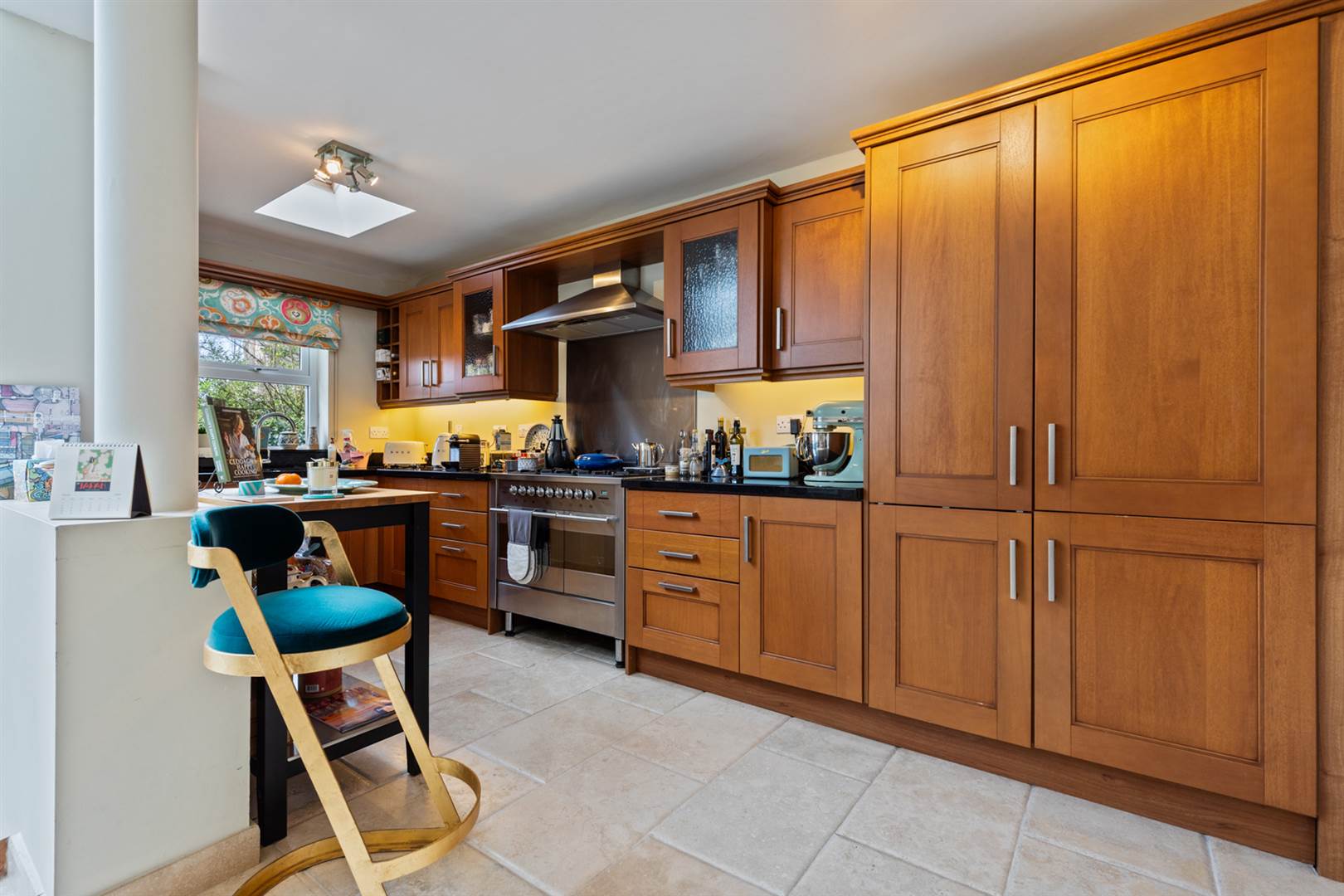 Solid wood kitchen finished in shaker style, glazed display cabinets, wine rack, under unit lighting, granite worktops with splash back. Stainless steel free standing range with five ring gas top, double and single ovens, dishwasher, one and a half sink unit with mixer taps, integrated fridge freezer, marble tiled floor. Open tread staircase leading to: